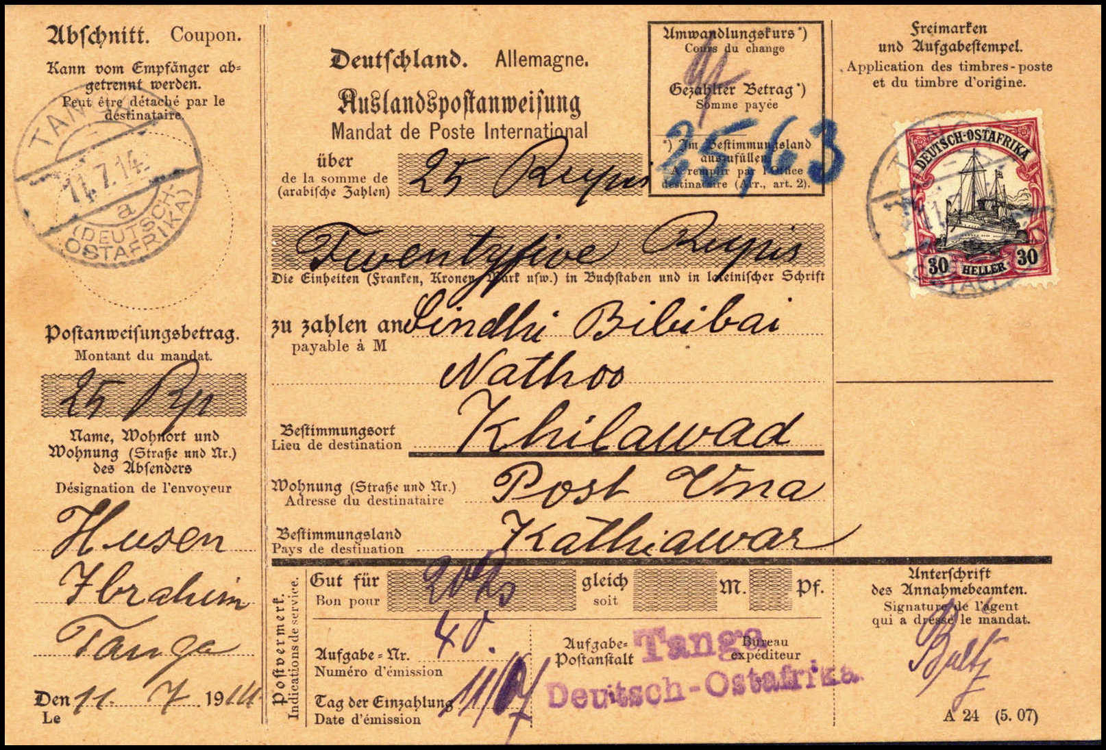 30 H., Einzelfrankatur auf vorzüglich erhaltener rosa Auslands-Postanweisung über 25 Rupien mit klarem Stempel TANGA 11/7 14 nach Indien adressiert. Wegen Kriegsausbruchs nicht mehr weitergeleitet und dem Absender später zurückgegeben