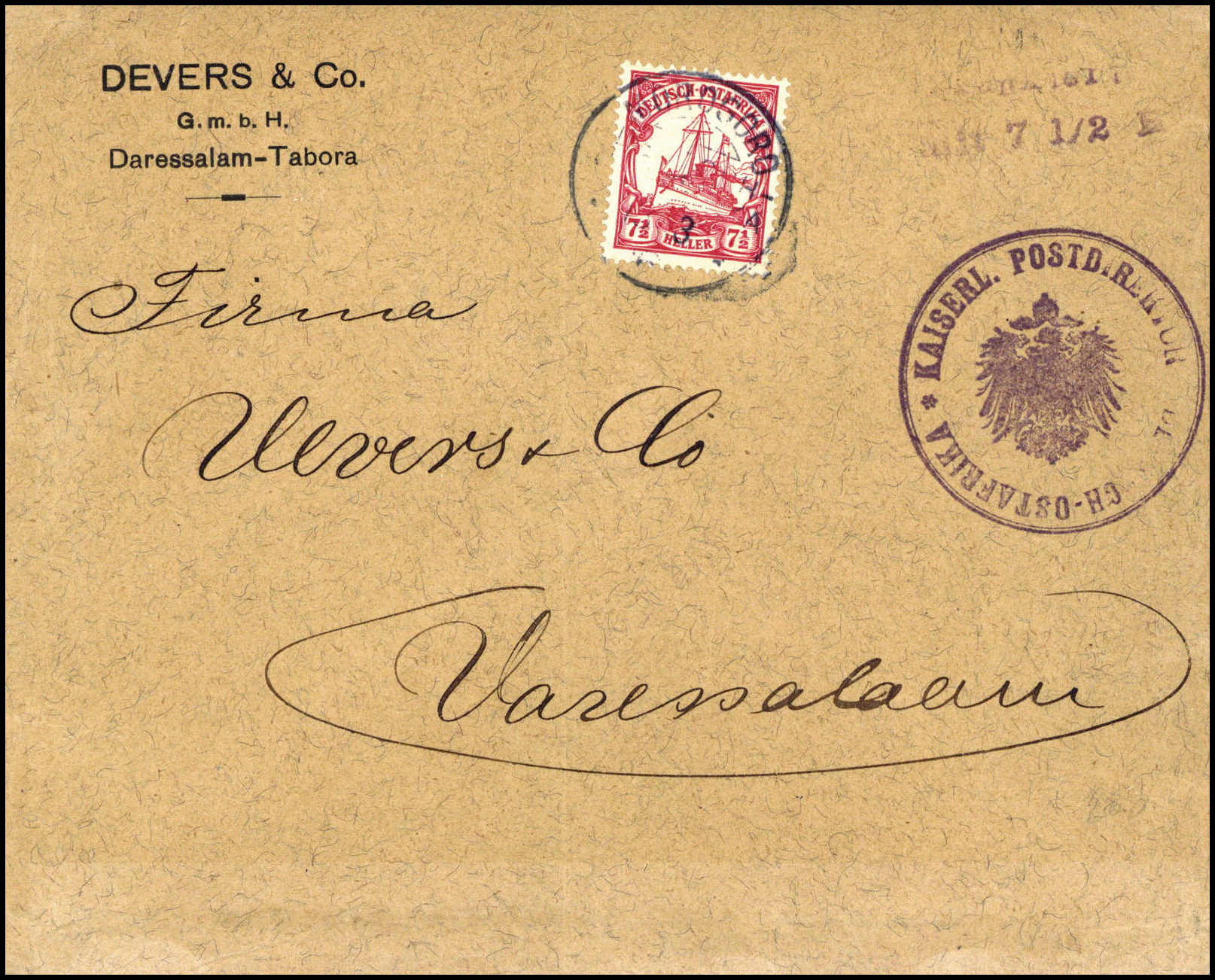 7½ H., tadelloses Exemplar als Zusatzfrankatur auf Vorausfrankierungs-Umschlag, Morogoro-Ausgabe 7½ H. violett mit zentr. Stempel MOROGORO 13/3 16 nach Daressalam mit Eingangsstempel. Eine besonders schöne und seltene Zweiarten-Frankatur