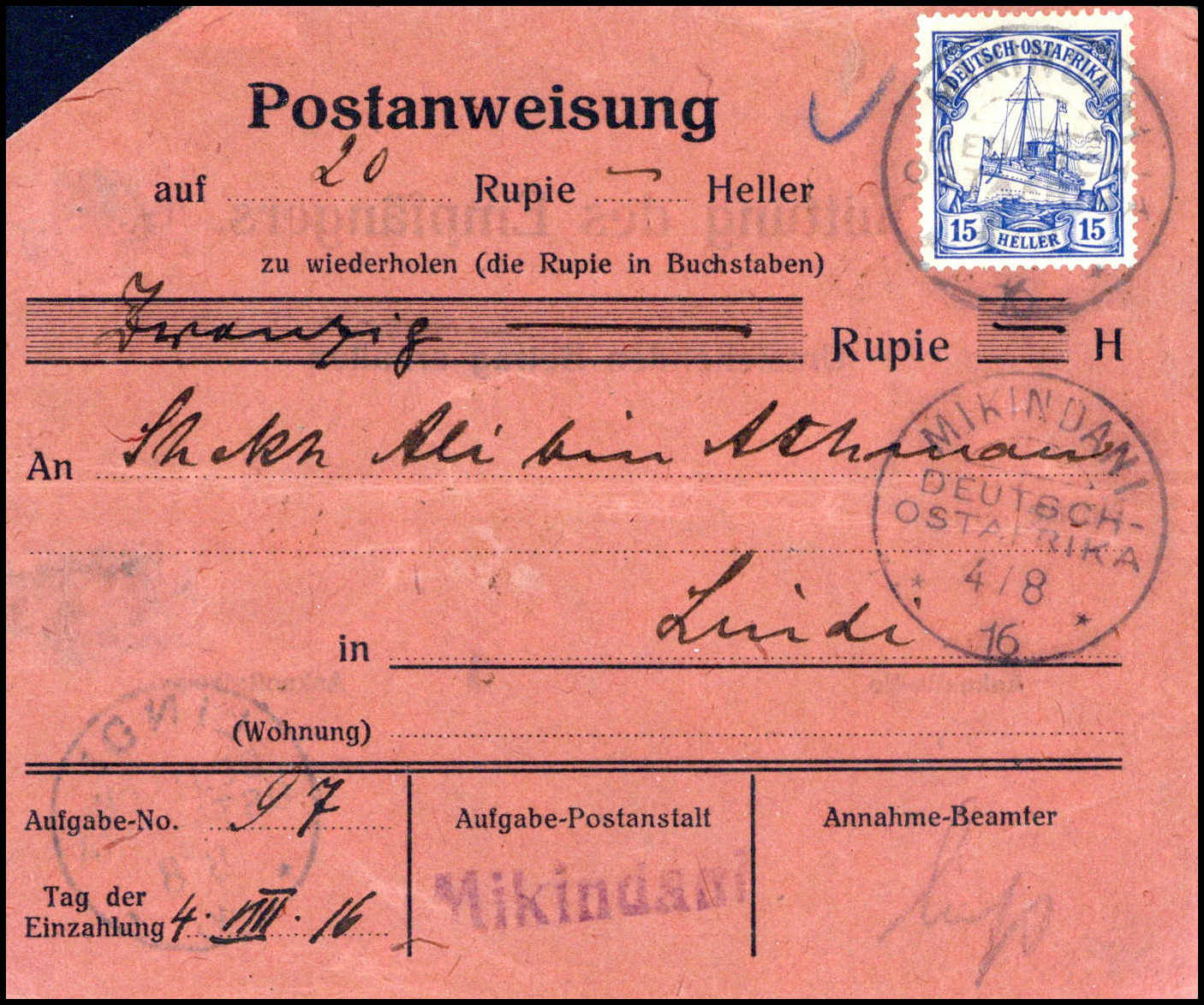 MIKINDANI mit Berliner Jahreszahl auf Not-Postanweisung: 15 H., tadellose Einzelfrankatur mit zwei sauber aufges. Stempeln MIKINDANi 4/8 16 (kleine Berliner Jahreszahl) auf dunkelrotem Postanweisungs-Formular über 20 Rupien nach Lindi