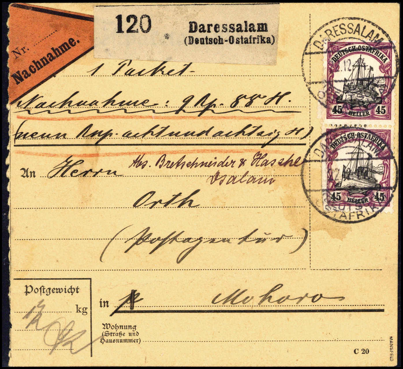 45 H., senkr. Paar auf aktenfrischer Nachnahme-Paketkarte über 2,88 Rp. nach Mohoro (untere Marke li. Zhg. nach vorne gebogen), klare Stempel DARESSALAM 22/12 14 (Kriegsdatum). Äußerst seltene, reine Mehrfachfrankatur der 45 H., sign.