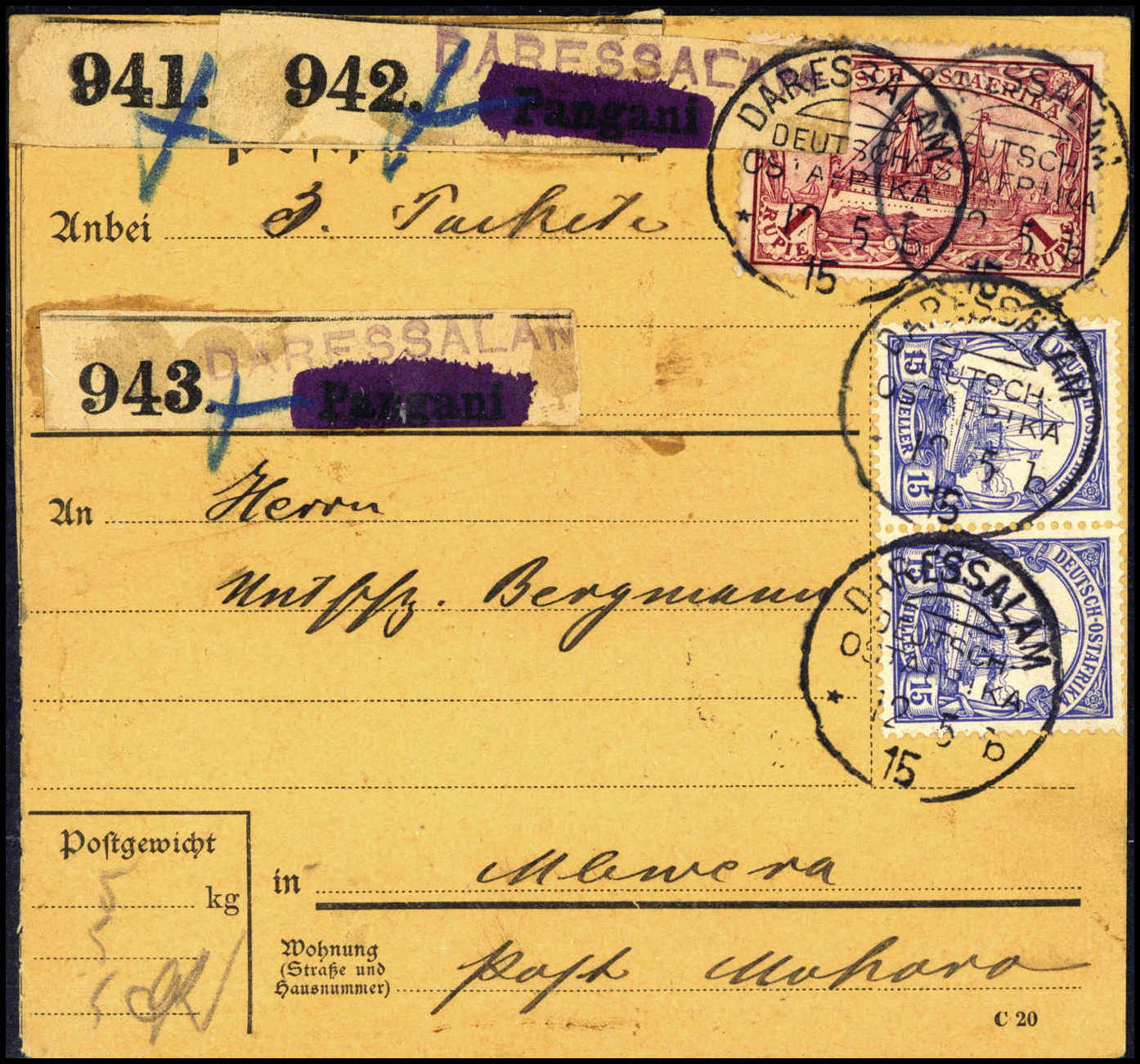 Sammel-Paketkarte zum ermäßigten Küstentarif: 1 R. mit waagr. Paar 15 H. vs. sowie senkr. Paar 2½ H. und Einzelstück 15 H. rs., alle in tadelloser Erhaltung auf schöner gelber Sammel-Paketkarte für drei Sendungen zu je 5 kg. nach Mbwera.