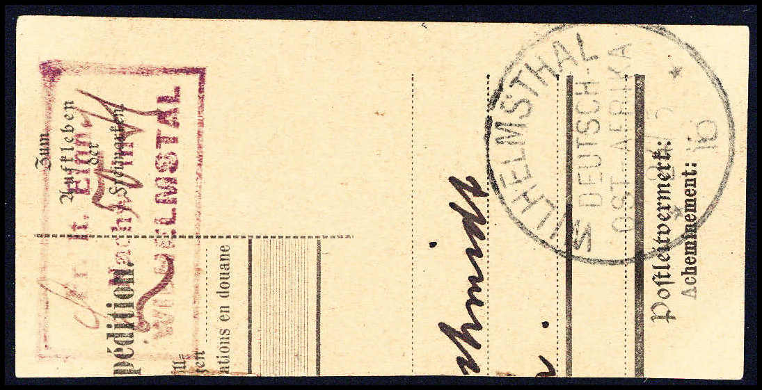 Inlands-Postanweisung: KOROGWE 3/6 (ohne Jahreszahl "16"), zweimal auf vollständigem, rotem Postanweisungs-Formular (während des Krieges in der Kolonie hergestellt) über 100 Rupien an die "Deutsche Schlächterei" in Wilhelmstal. Re. oben