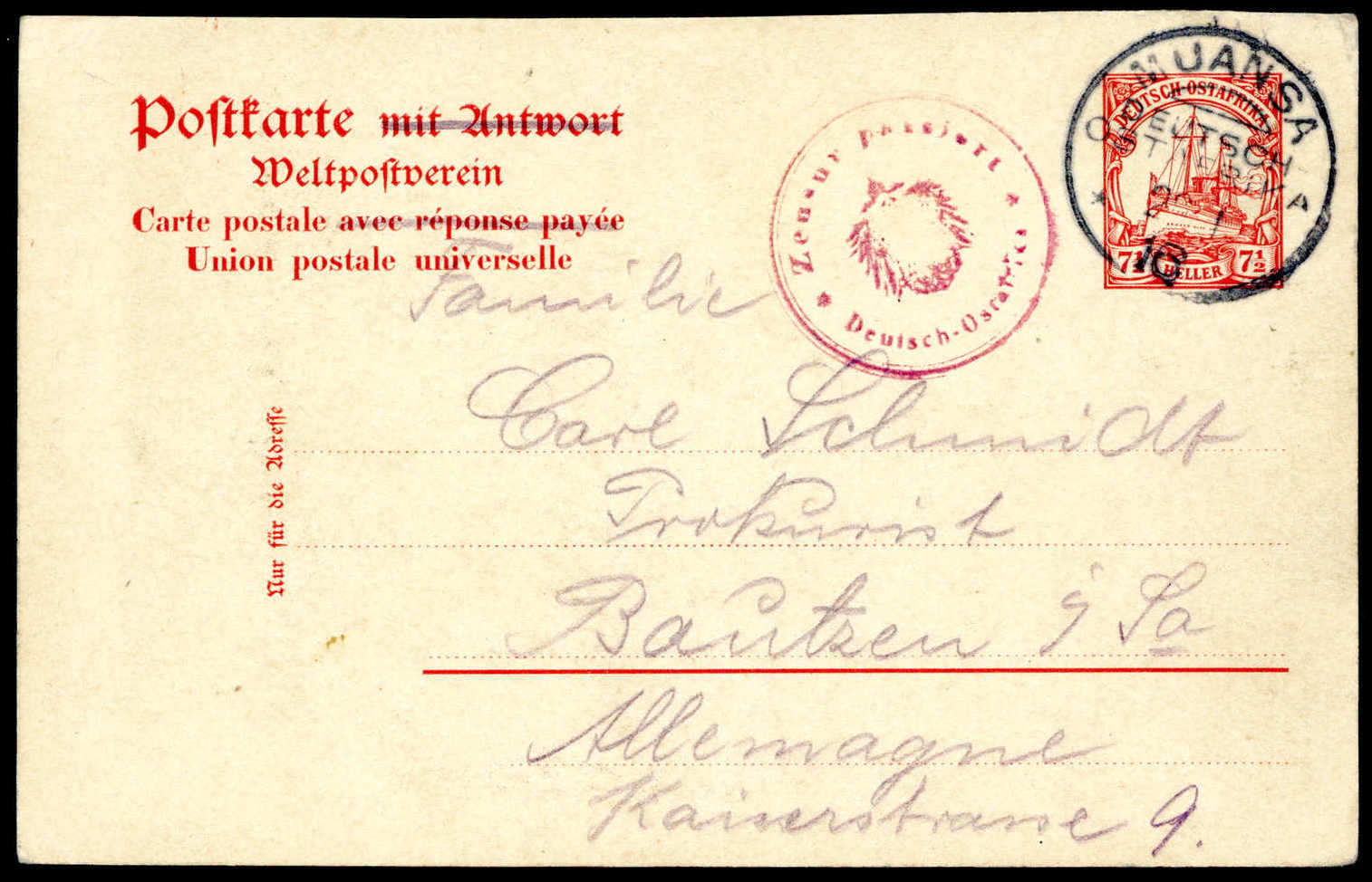 MUANSA 28/1 16, klar auf Postkarte 7½ H. nach Deutschland adressiert, beiges. violetter Zensurstempel der Postüberwachungsstelle Daressalam. Zustellung erst nach Kriegsende in Deutschland