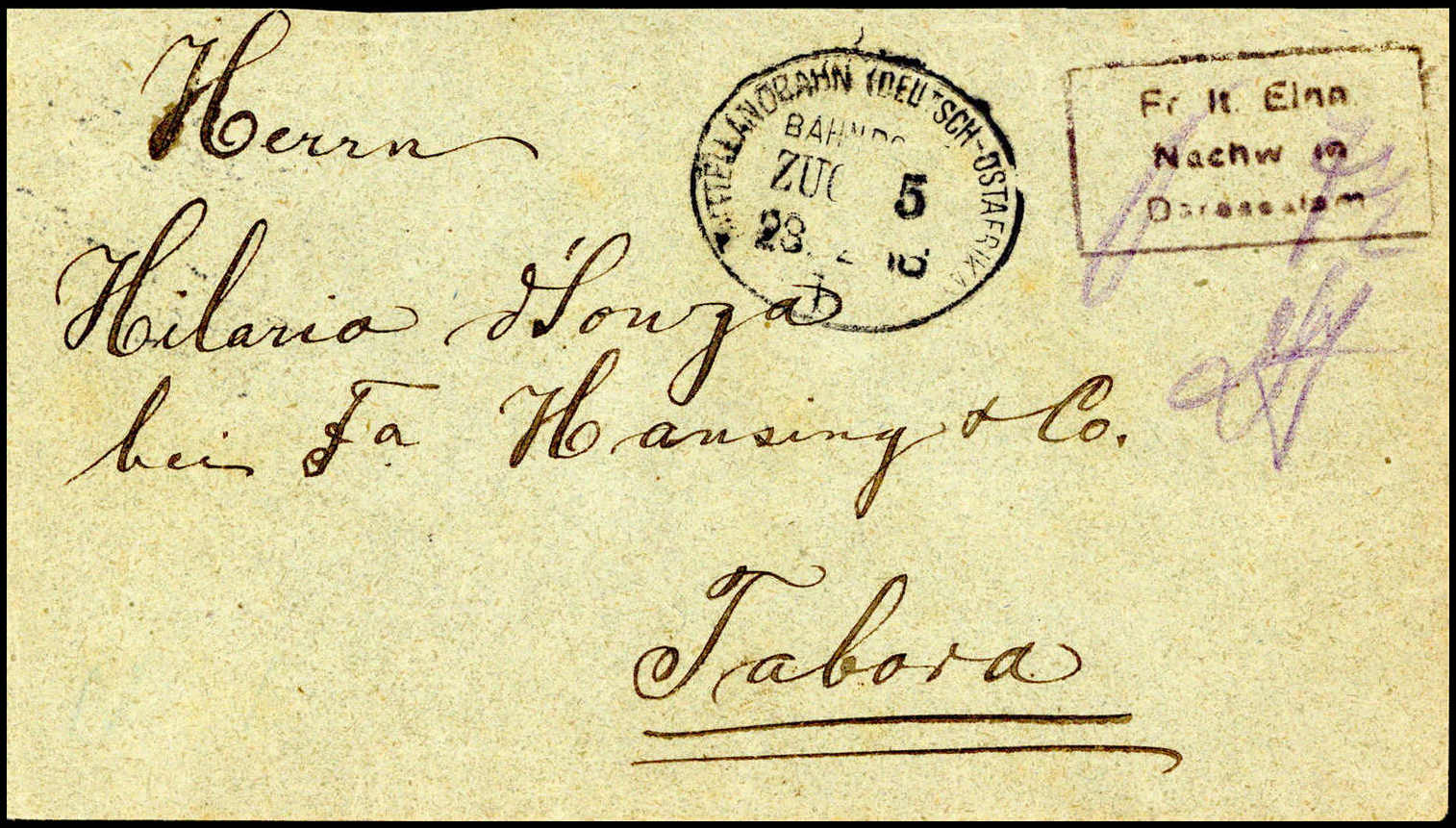 MITTELLANDBAHN BAHNPOST ZUG 5 "b" 28/2 16, nebst Barfrankierungs-R3 von Daressalam auf kleinem grünem Brief nach Tabora