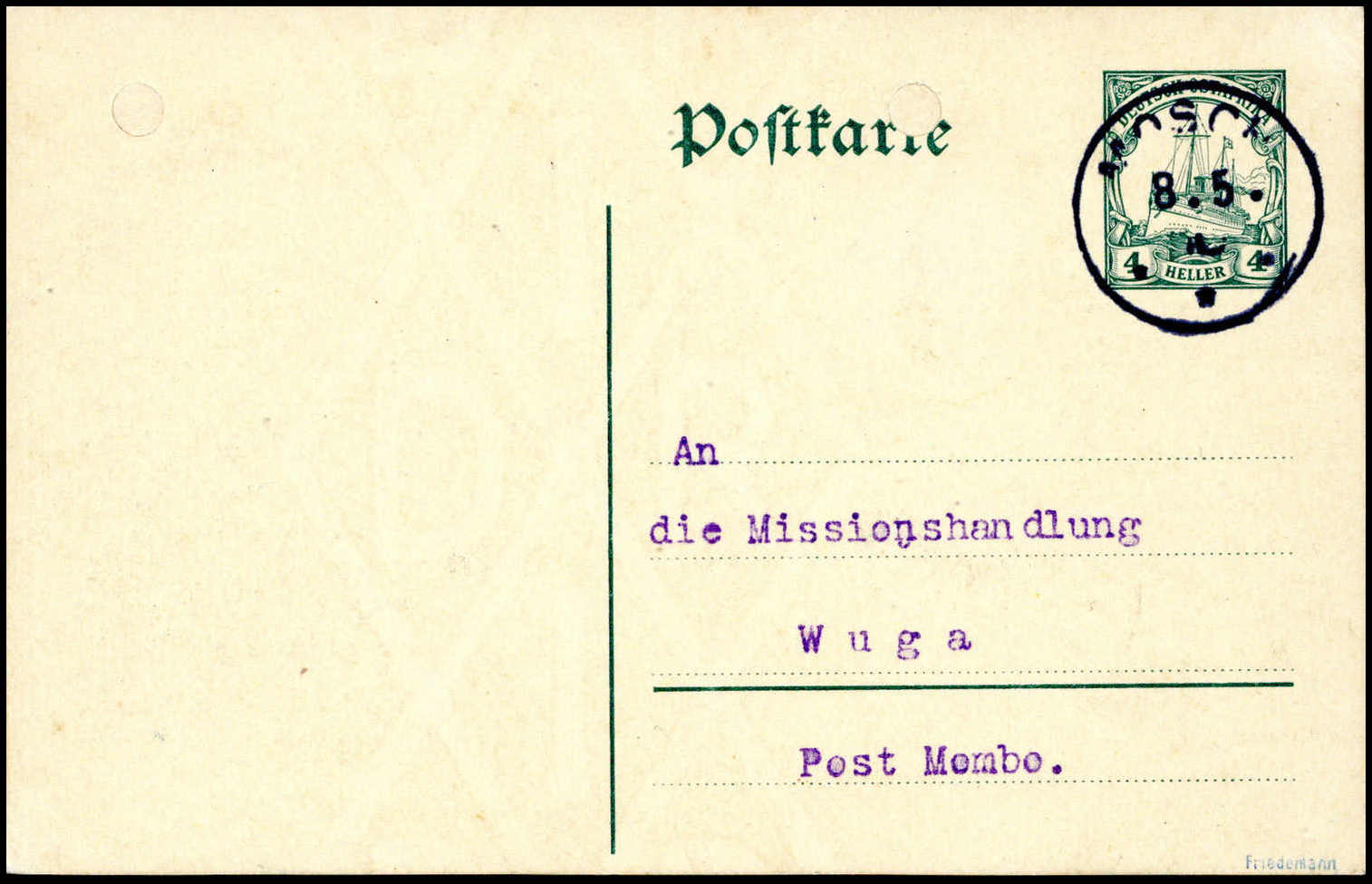 Weiterverwendung des Ortsstempels MOSCHI: MOSCHI 8/5 16 auf gelochter Postkarte 4 H. an die Missionshandlung Wuga, datiert "Schigati 6/5 16". Selten