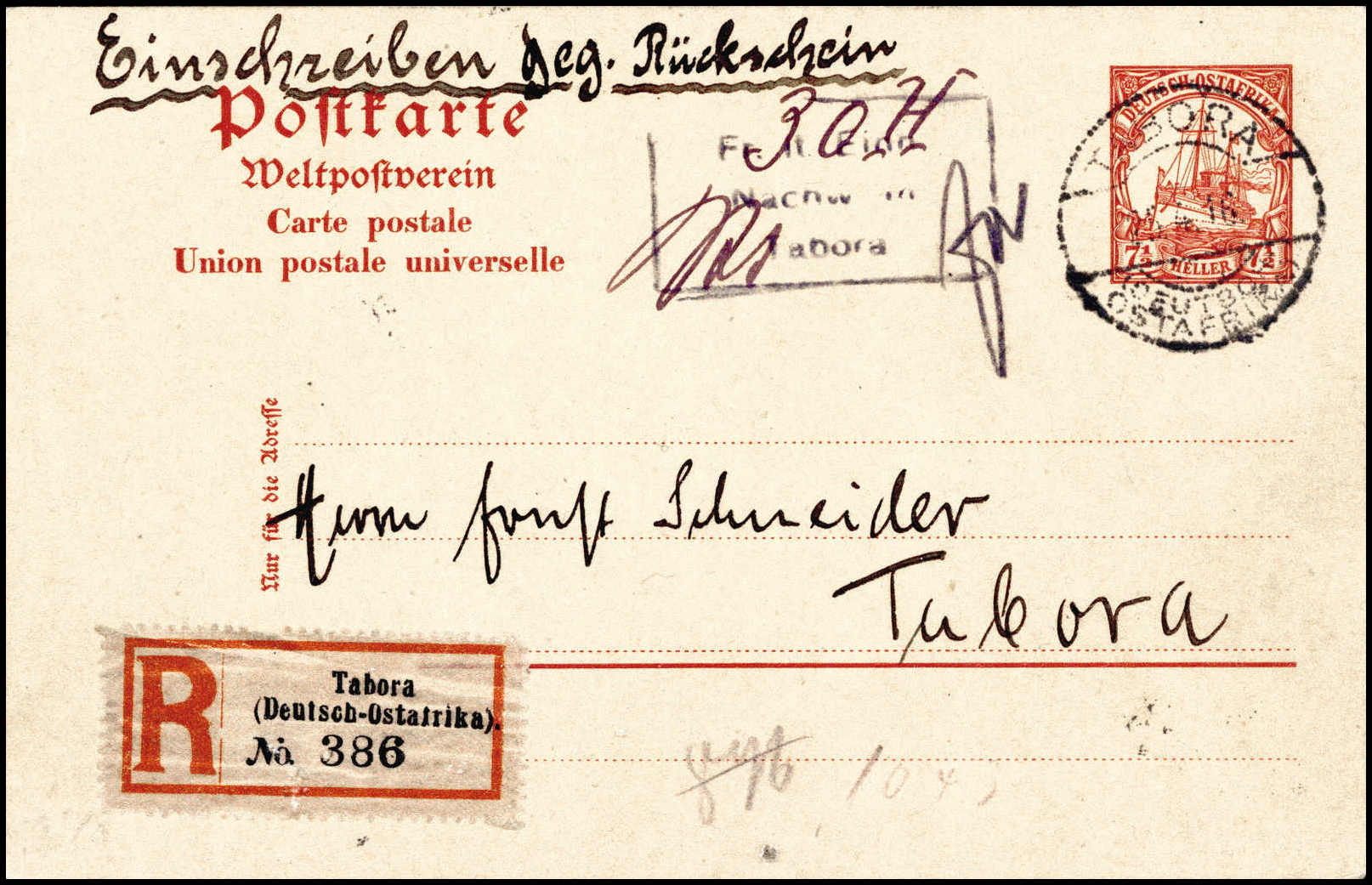 "Zweiarten-Frankierung auf Einschreibe-Rückscheinkarte: TABORA 25/4 16 auf tadelloser Ganzsachenkarte 7½ H. mit beiges. blauem Barfrankierungs-R3 von Tabora mit hs. Portovermerk "30 H." als Einschreibe-Rückschein-Postkarte. Hierfür waren