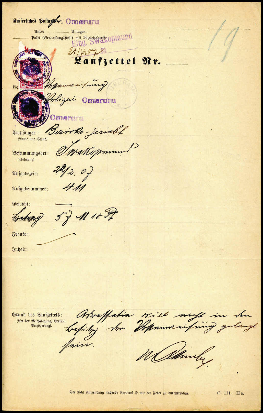 frankierter Laufzettel von Deutsch-Südwestafrika bekannt