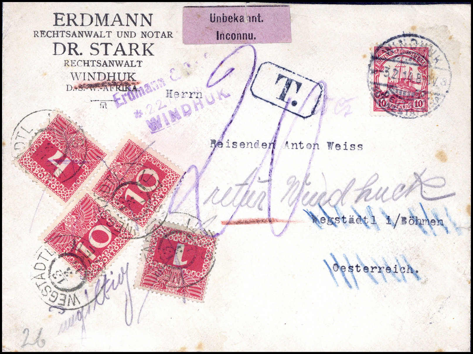 10 Pfg., Einzelfrankatur auf Rechtsanwalts-Vordruckkuvert mit klarem Stempel WINDHUK 3/2 14 nach Österreich. Unterfrankiert, daher in Österreich mit vier Nachportomarken versehen und nach Windhuk zurückgesandt. Trotz Beförd.-Spuren ein