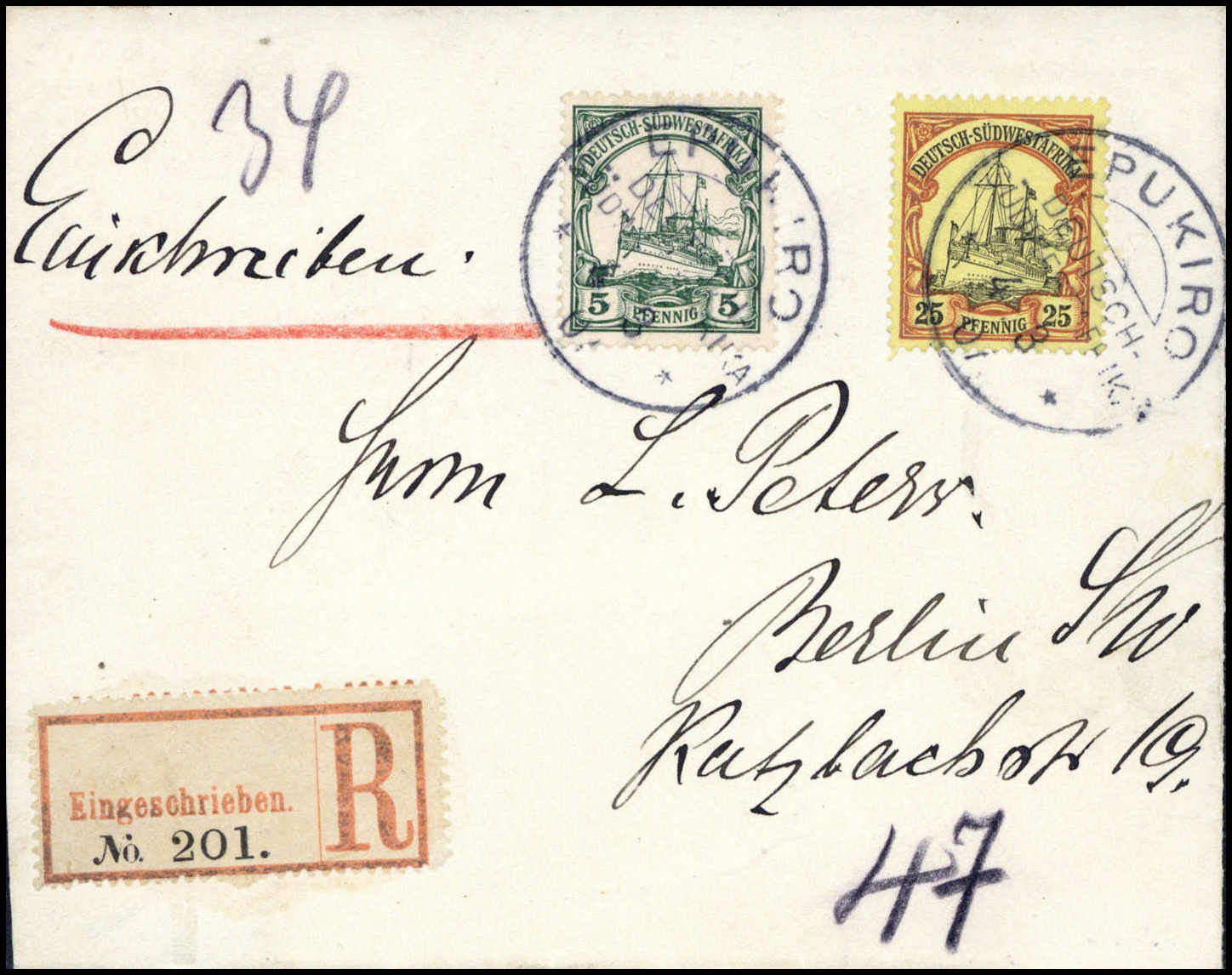 AUS auf Stempel KUBUB 16/10 06, ein erstklassiger Abschlag, wobei sowohl der Gummistempel als auch der Ortsstempel von Kubub perfekt lesbar sind, auf tadellosem kl. Brief 10 Pfg. nach Berlin (bei der Marke handelt es sich um eine sog.