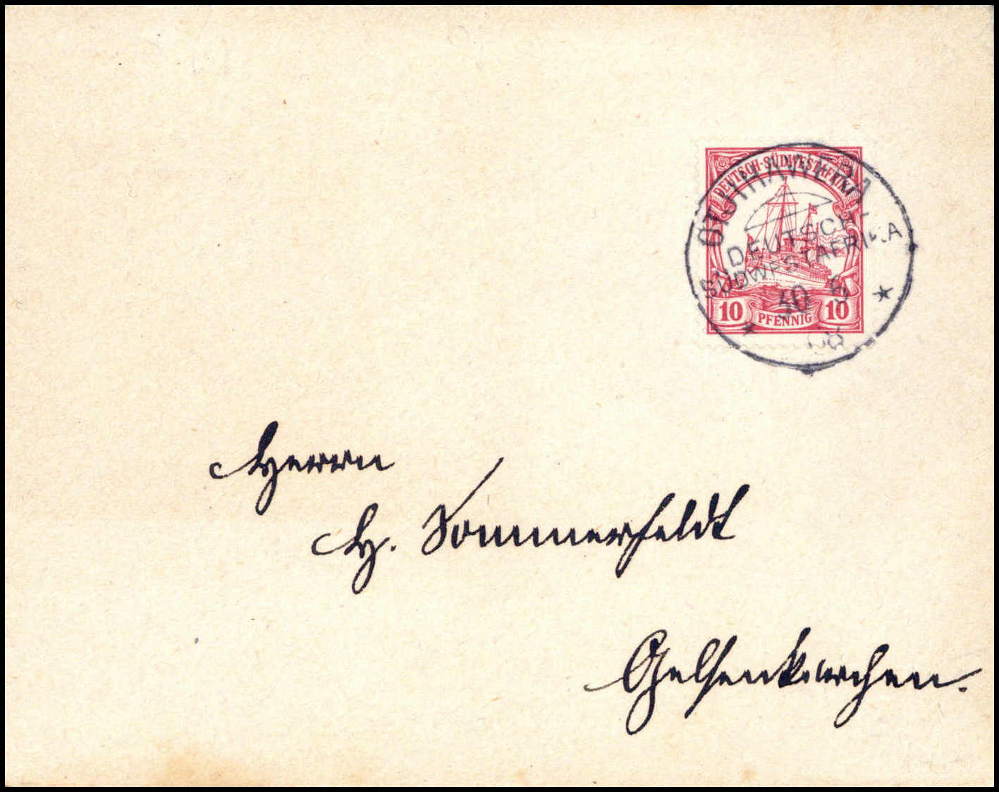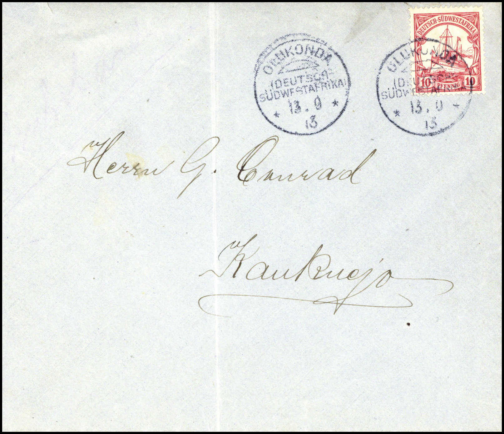 "Otjosasu", hs. Abs.-Vermerk vs. auf Brief 5 Pfg. (Aufklebefehler) mit Aufgabestempel OKAHANDJA 9/12 13. Von den wenigen bekannten Briefen mit Otjosazu-Stempeln stammen zwei von dem Absender dieses Briefes
