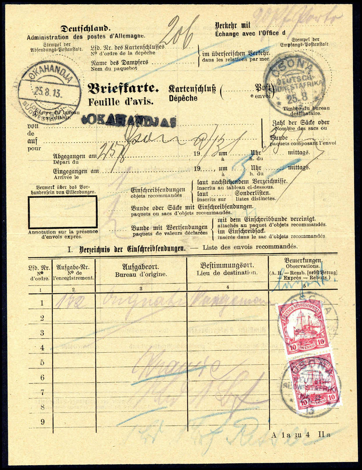 OSONA 25/8 13, drei klare Abschläge zusammen mit zwei versch. Stempeln von Okahandja auf gef. Briefkarte, frankiert mit senkr. Paar 10 Pfg. (obere Marke Aufklebefehler). Derartige Postformulare von Osona sind ganz große Seltenheiten