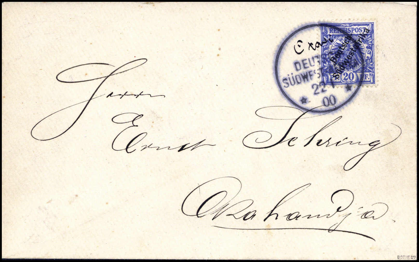 "Otavi", hs. (Handschrift 1b) mit Wanderstempel vom 22.1.00, perfekt auf tadellosem Inlandsbrief 20 Pfg. nach Okahandja adressiert. Von dieser Handschrift sind bisher nur Belege aus 1899 bekannt. Selten, sign. Bothe BPP