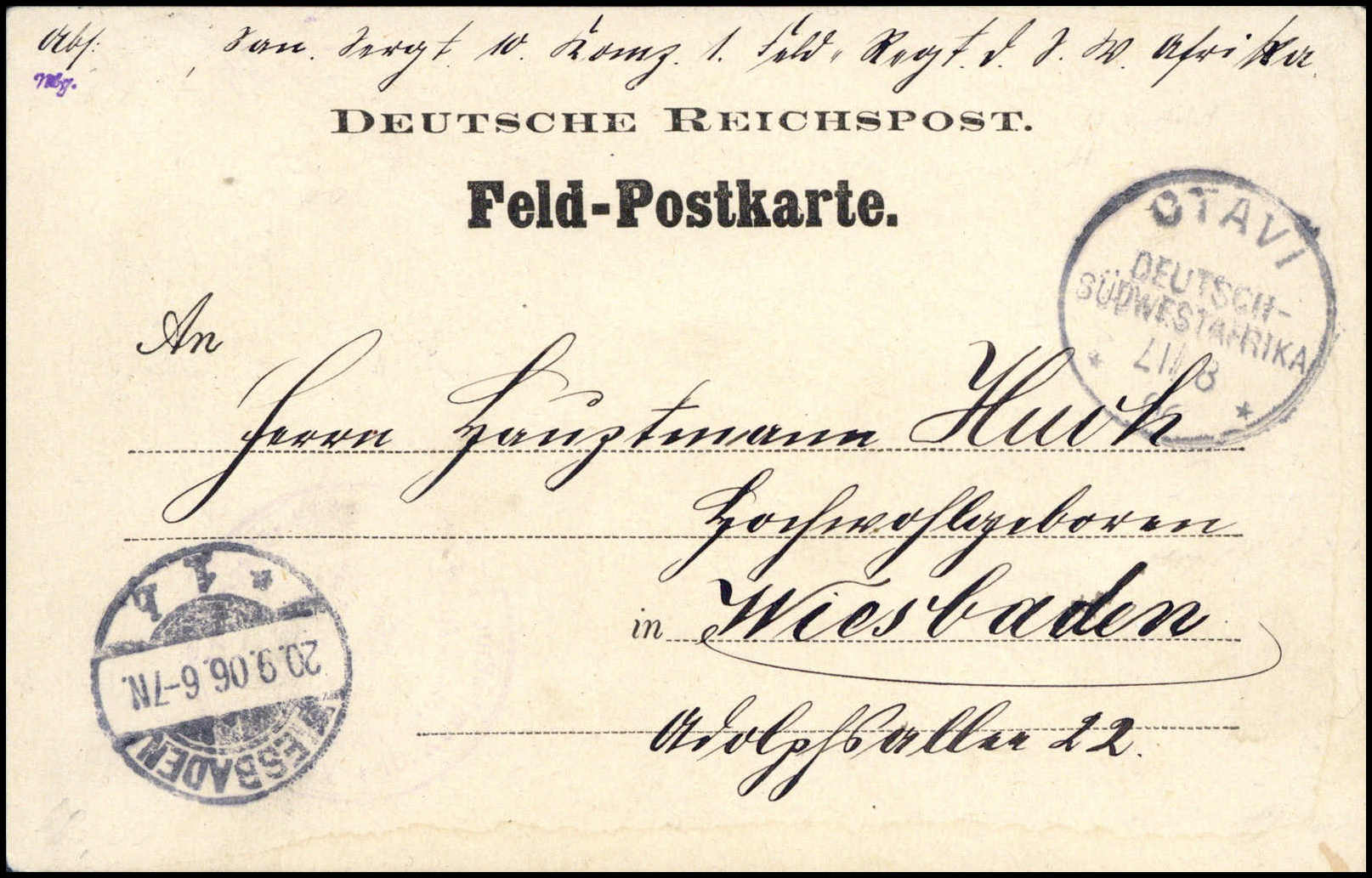 OTAVI "17"/8 06 (kopfstehende Tageszahl), klar auf tadelloser Feldpostkarte