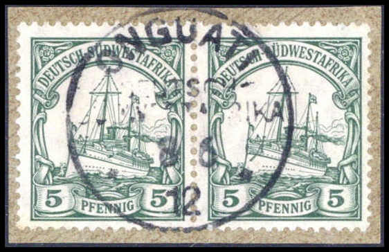 ONGUATI 8/6 12, klar auf tadellosem, waagr. Paar 5 Pfg. auf Briefstück