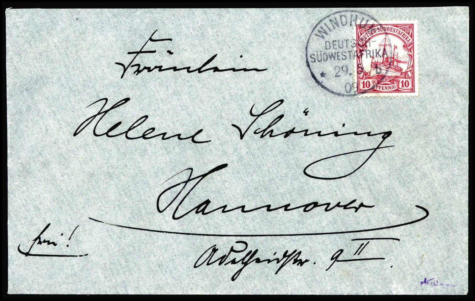 vollem Abs.-Vermerk "Otter in Uhabis via Steinkopf, DSWA". Eine der seltensten Aushilfs-Entwertungen Deutsch-Südwestafrikas in einem außergewöhnlich schönen Beleg, doppelt sign. Czimmek BPP, Fotoattest Steuer BPP