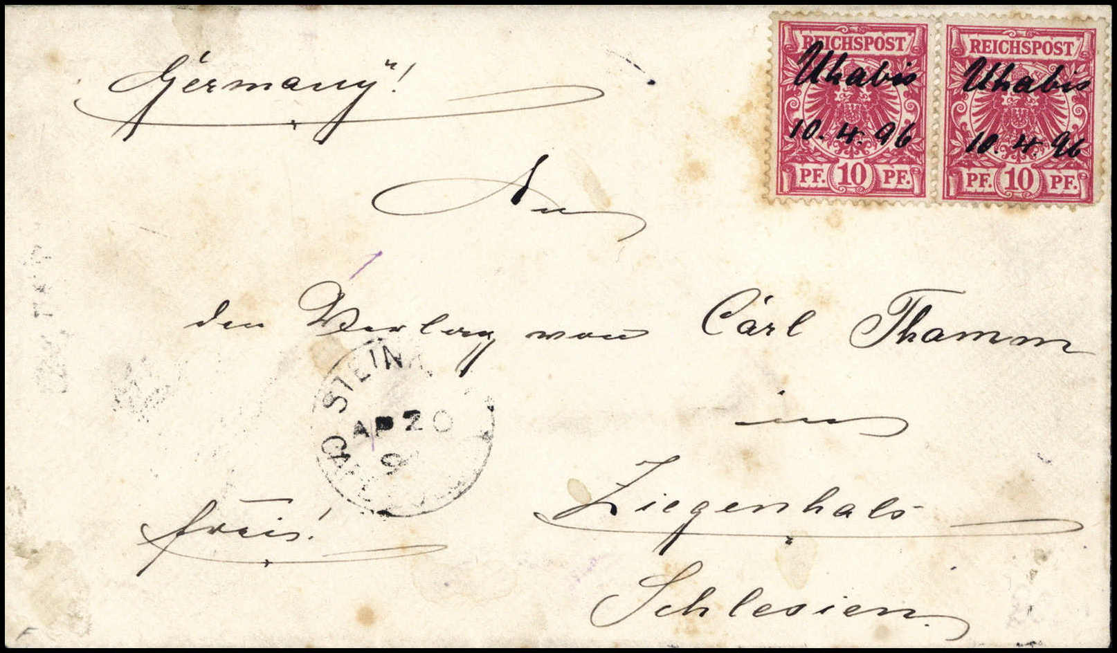 "Uhabis 10.4.96", hs. Entwertung auf schönem kl. Kuvert mit waagr. Paar Vorläufer 10 Pfg. nach Dtld., Durchgangsstpl. STEINKOPF 20/4 96. Eine Marke etwas stumpfer Eckzahn und min. Fleckchen, wie bei allen frühen Uhabis-Briefen. Rs. mit