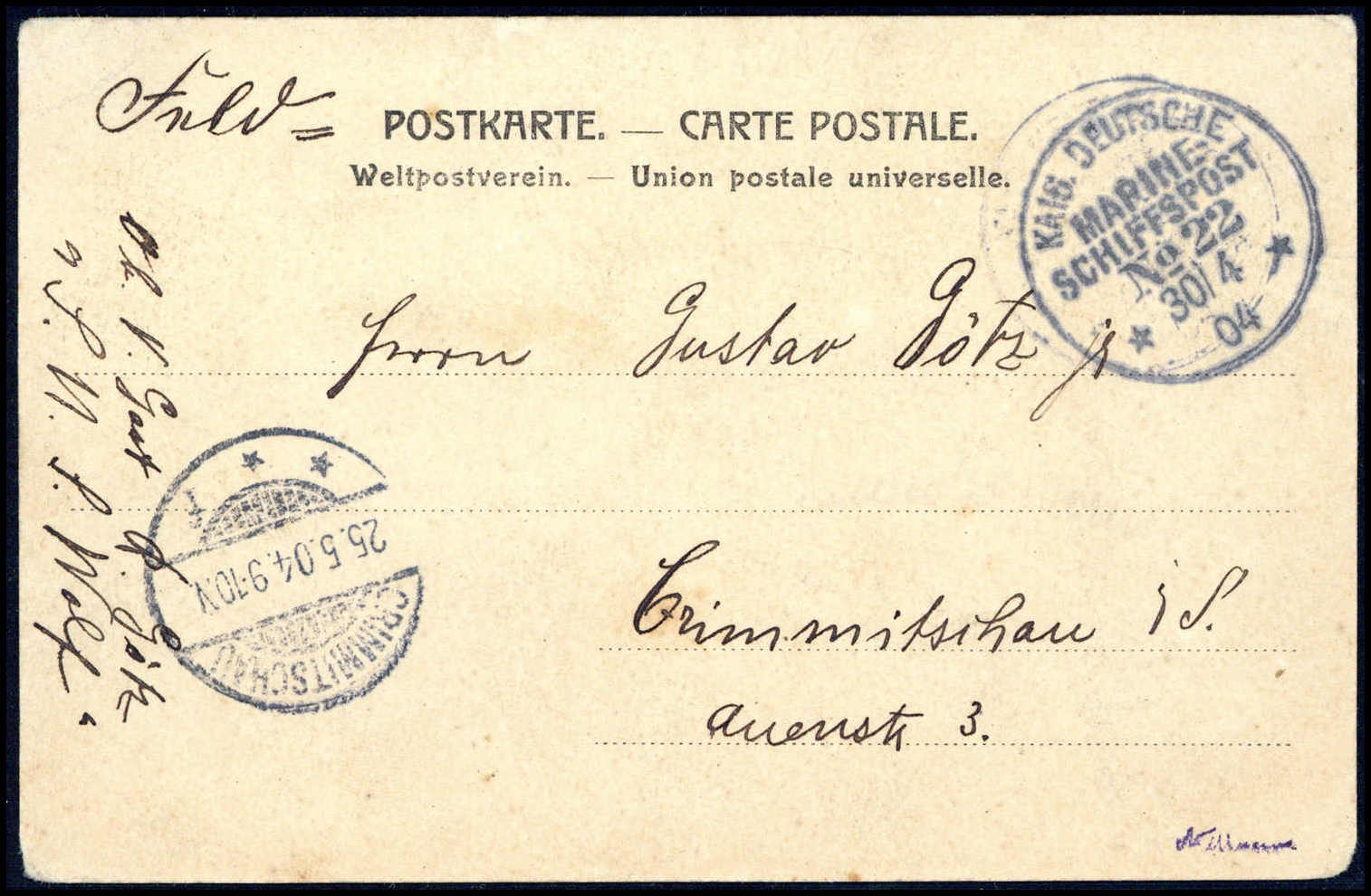 MSP No.22 (SMS "Wolf") 30/4 04, klar auf Feldpost-Ansichtskarte ("Swakopmund") nach Deutschland. Portofreie Marine-Schiffspost während des Herero-Aufstands war von diesem Schiff nur im April und Mai 1904 möglich, sign. Willmann