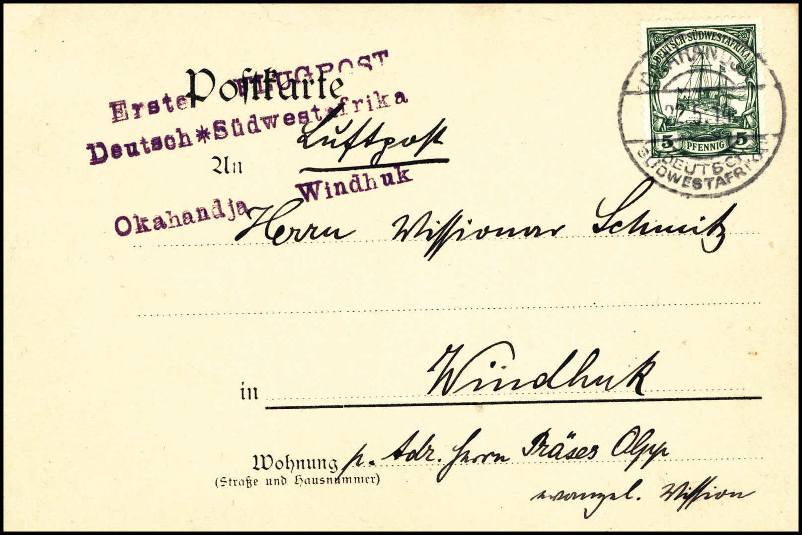 Letzte Flugetappe mit Postauflieferung 22.5.1914: "Erste FLUGPOST Deutsch-Südwestafrika Okahandja Windhuk", violetter L3 gestochen klar auf tadelloser Postkarte 5 Pfg. mit idealem Aufgabestempel OKAHANDJA 22/5 14 nach Windhuk. Mit diesem