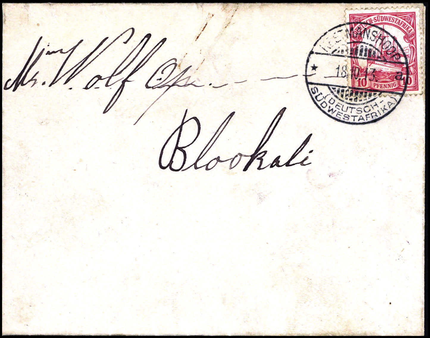 BERLIN 13/8 10, klar auf gef. Brief Germania 10 Pfg. nach Lüderitzbucht. Rs. mit hs. Vermerk "Versehentlich geöffnet, Inhalt betrifft mich nicht, W. Schütze". Von diesem an das Postamt Lüderitzbucht gegeben und mit Vermerk "amtlich