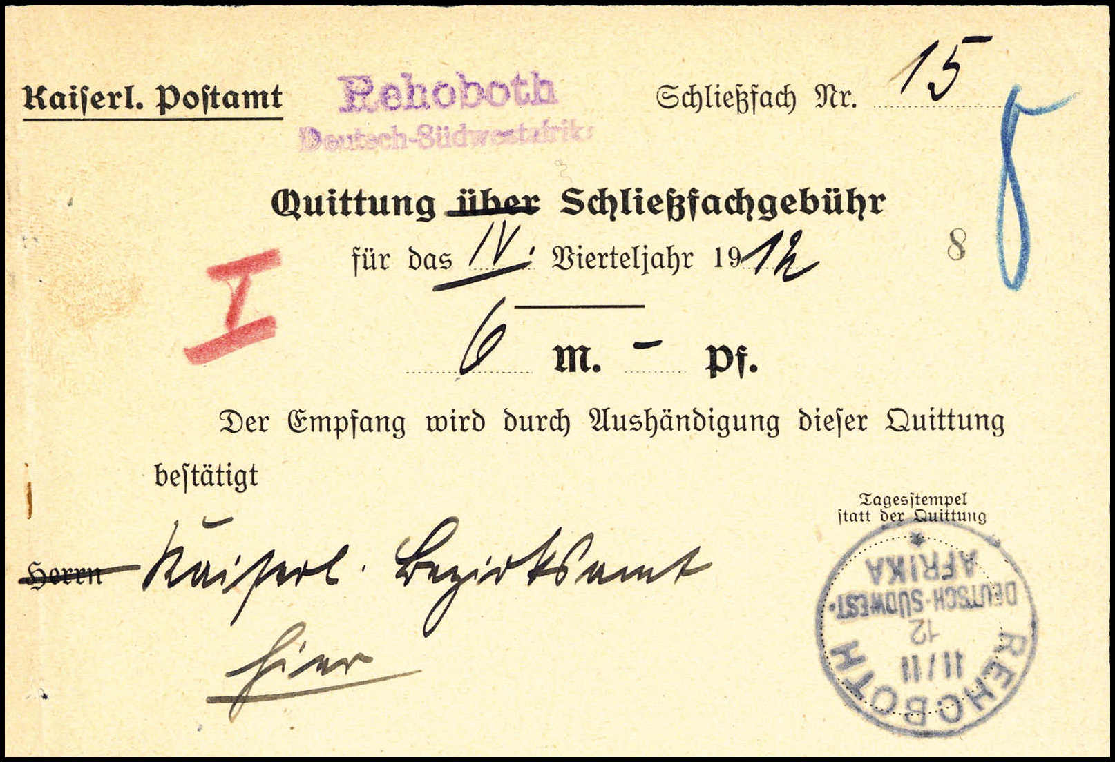 1912, "Quittung über Schließfachgebühr" über 6 Mark mit Stempel REHOBOTH 11/11 12