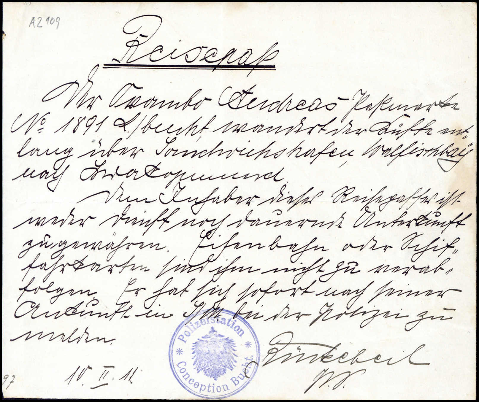 POLIZEISTATION CONCEPTION BUCHT 10.2.11 auf gefaltetem, hs. ausgestelltem Reisepass für einen Ovambo. Selten