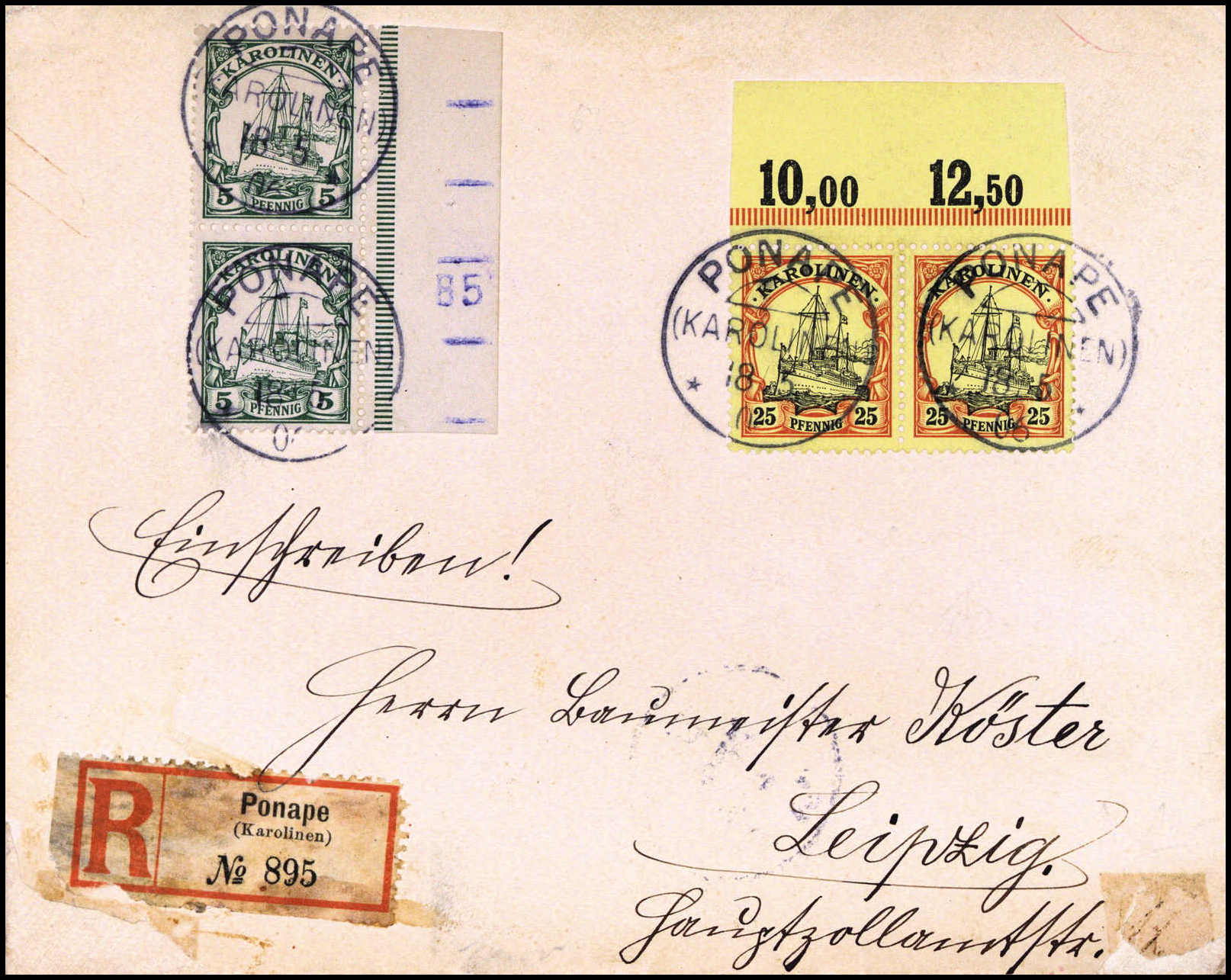 5 Pfg., senkr. Bogenrandpaar mit violettem Zentimetermaß-Aufdruck "B 5" zusammen mit waagr. Oberrandpaar 25 Pfg. auf Einschreibebrief nach Leipzig (unten etwas hinterklebt), klare Stempel PONAPE 18/5 06. Sehr selten