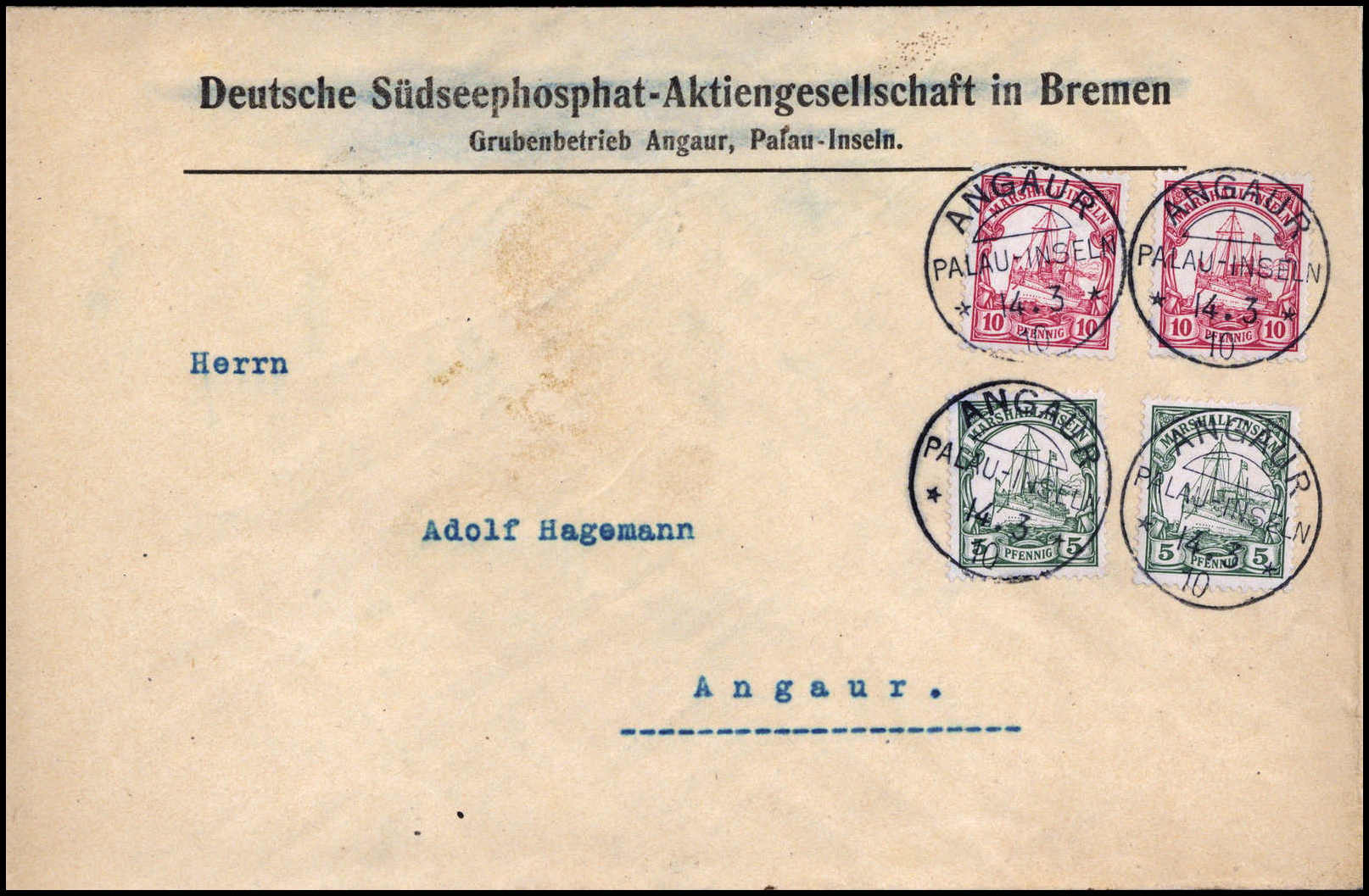 Ersttag des Angaur-Provisoriums: Marshall-Inseln 5 und 10 Pfg., je zwei tadellose Exemplare mit idealem Stempel ANGAUR 14/3 10 auf Firmenkuvert der Südsee-Phosphat-AG (Umschlag Gebrauchsspuren). Vgl. Michel-Spez.-Kat. S.688 unten: "Von