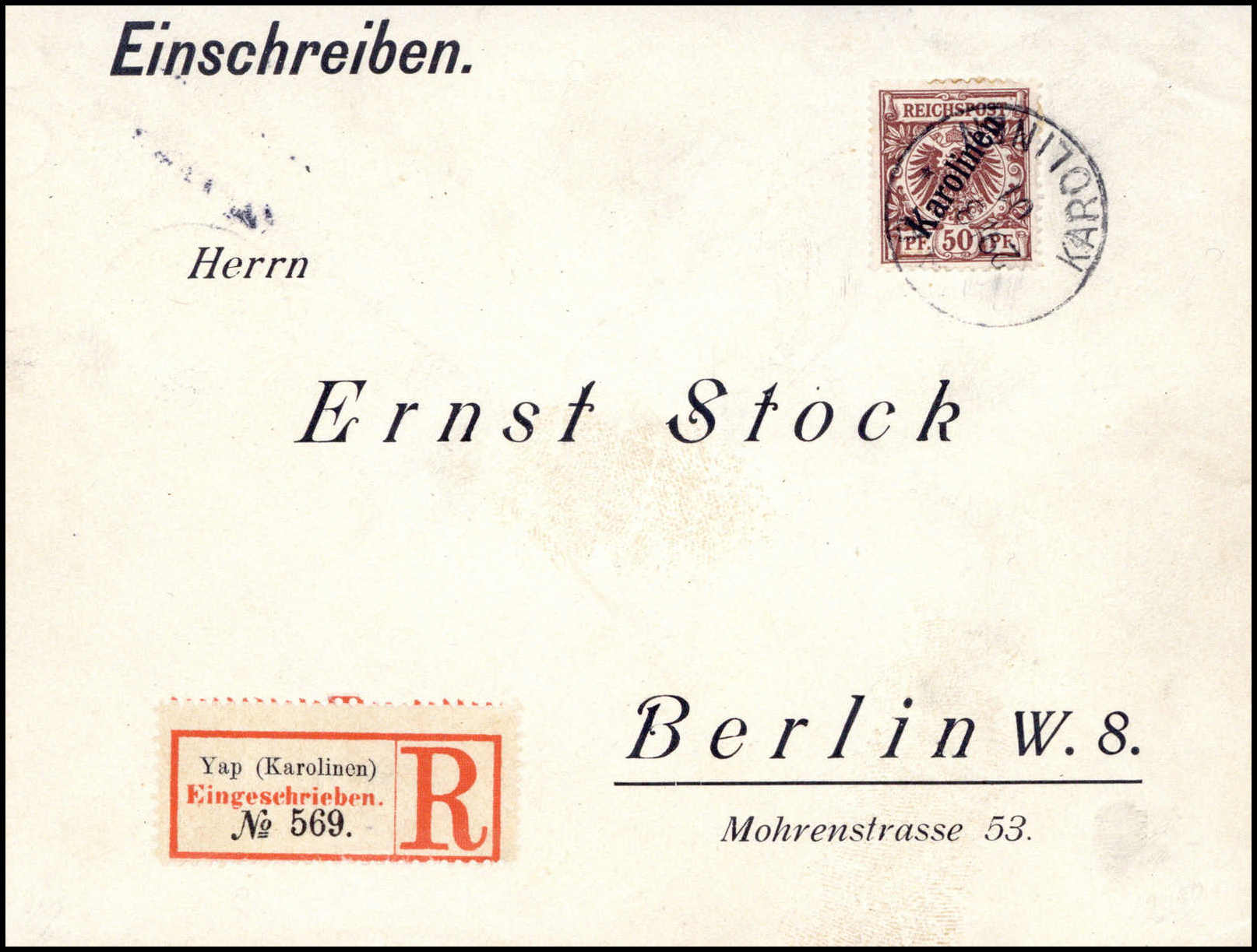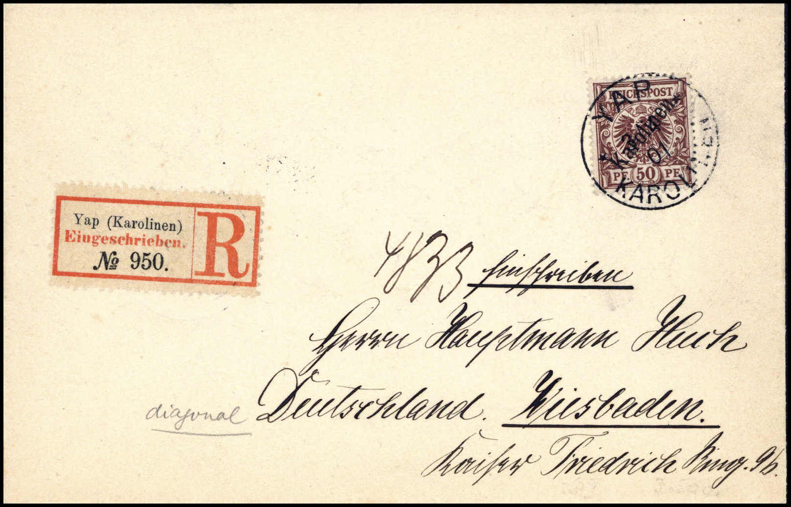 50 Pfg., tadellose Einzelfrankatur mit klarem Stempel YAP 3/4 01 auf vorzüglich erhaltenem weißem Einschreibebrief nach Wiesbaden mit Ak.-Stempel. In dieser schönen Erhaltung selten, Fotoattest Jäschke-L.BPP. Katalogpreis: 3.800,-