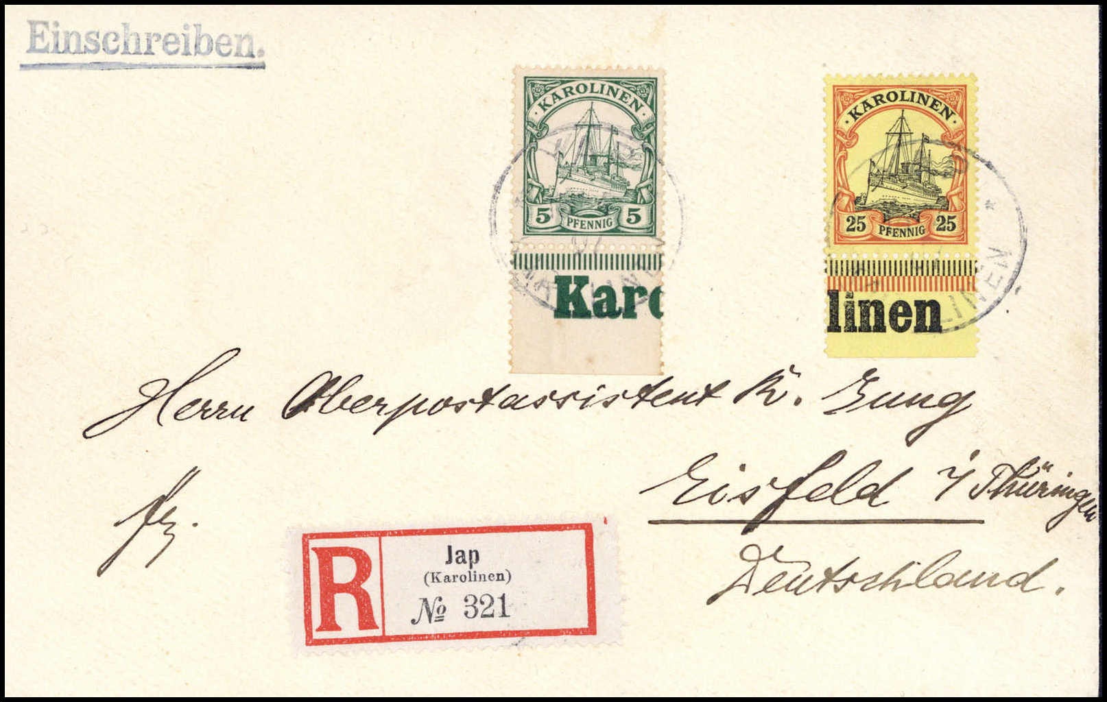 5 und 25 Pfg., tadelloser, portoger. frankierter R-Brief mit Stempel YAP nach Dtld
