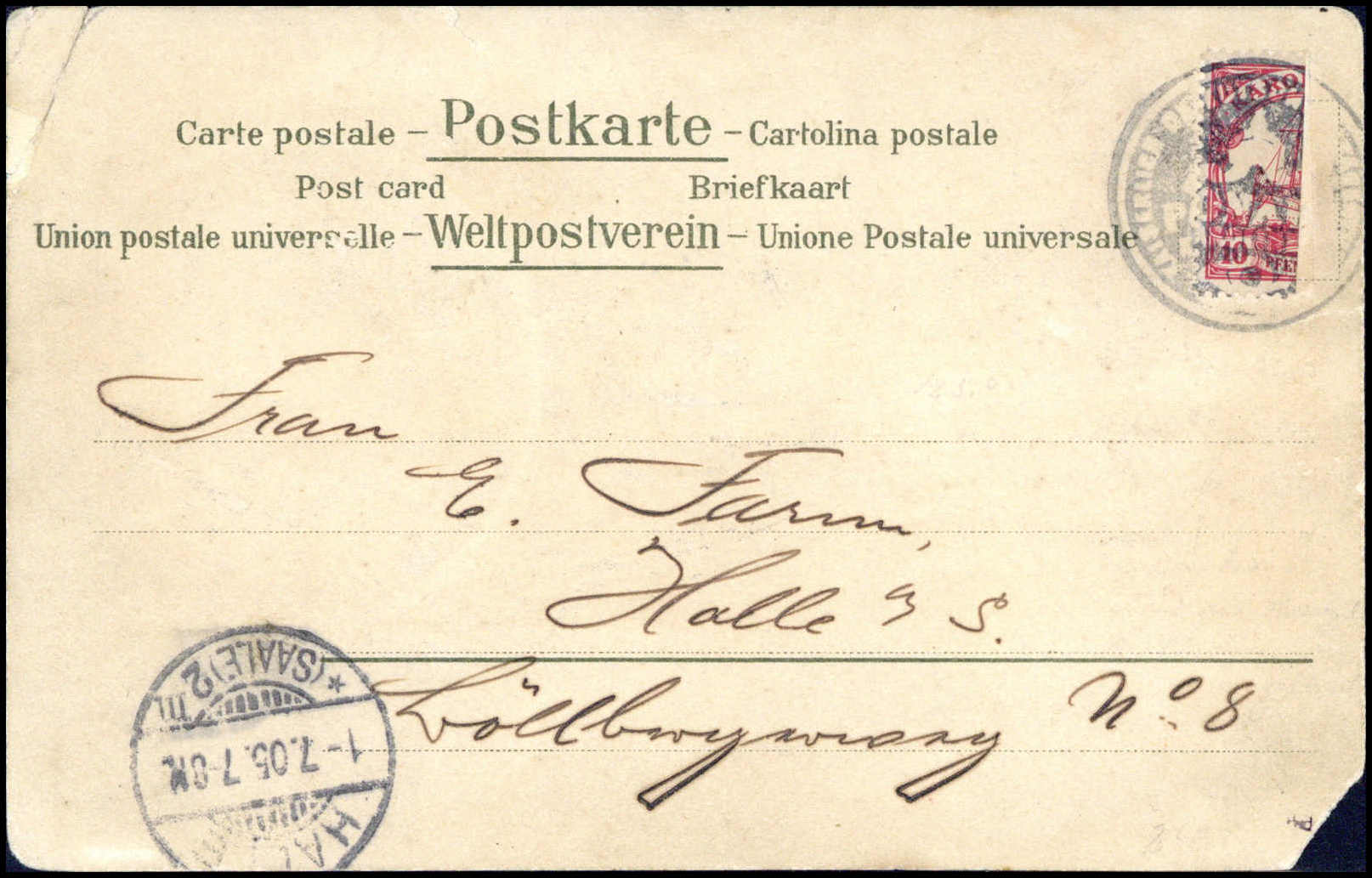10 Pfg., senkr. Halbierung (li. Hälfte), tadelloses Exemplar mit Dienstsiegel-Entwertung auf nach Dtld. gelaufener, etwas fehlerhafter Postkarte mit Eingangsstempel. Katalogpreis: 500,-