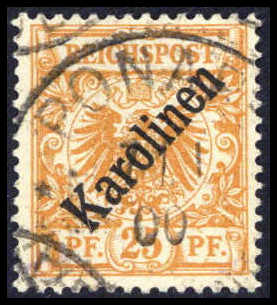 25 Pfg., tadelloses, besonders tieffarbiges Exemplar mit Stempel PONAPE 7/1 00. Selten, sign. Schlesinger, Fotoattest Jäschke-L.BPP. Katalogpreis: 3.400,-