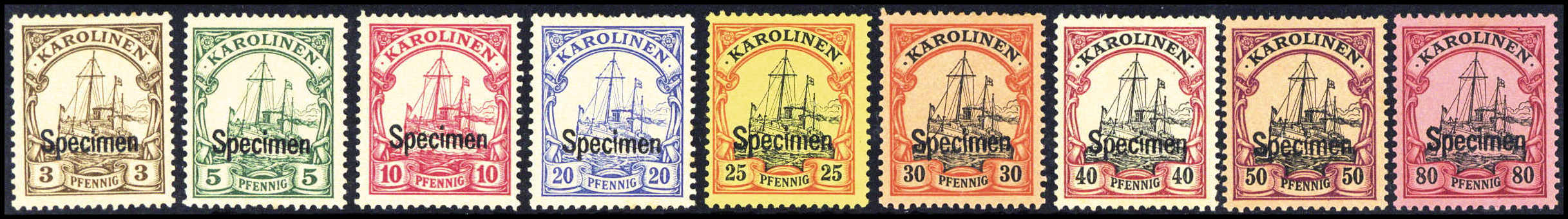 3 Pfg.-5 Mk., die kpl. Serie mit Aufdruck "Specimen", sauber ungebr. (einige Kleinwerte übliche Zf.). Katalogpreis: 1.200,-
