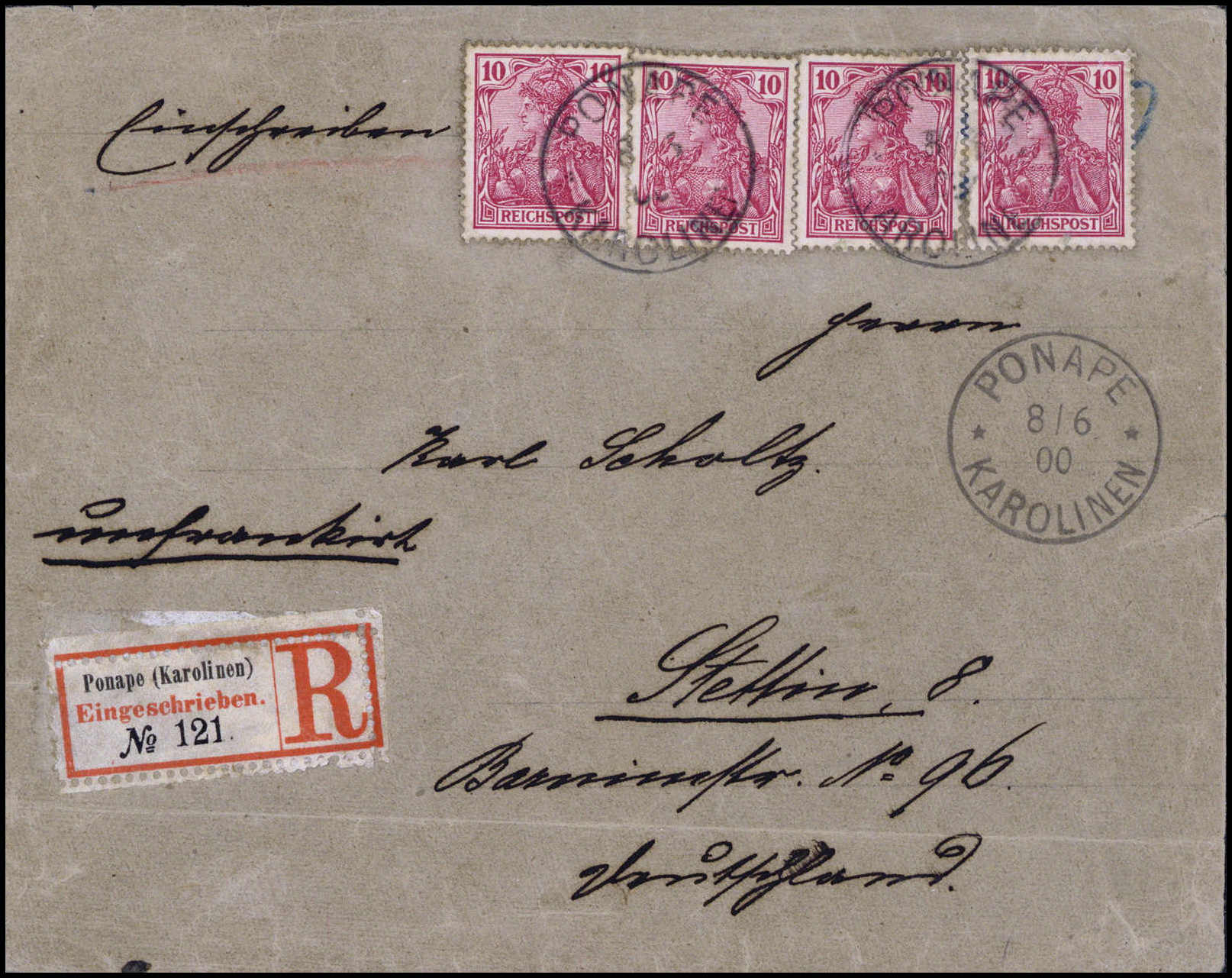 PONAPE 8/6 00, auf Einschreibebrief nach Stettin mit hs. Vermerk "unfrankiert". Der Brief wurde offenbar in Ponape mit vier Germania-Marken zu je 10 Pfg. nachfrankiert und erhielt dort auch seinen R-Zettel. Beförderung vermutlich mit