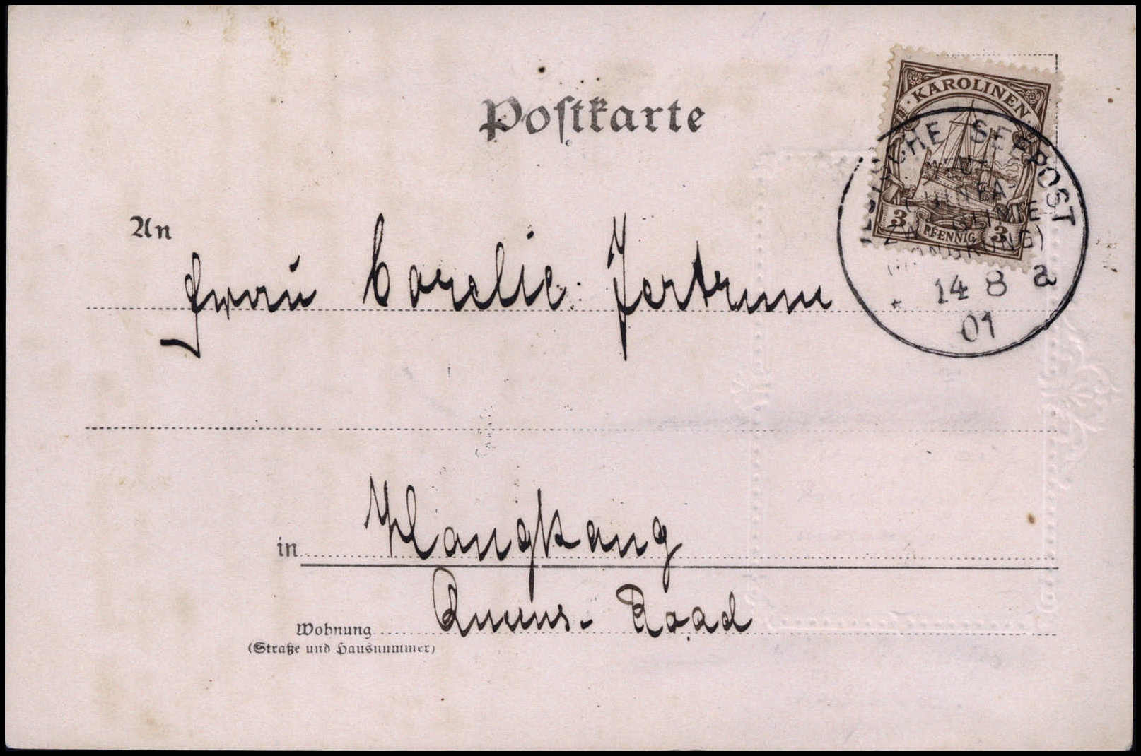 Dampfer "Nuen-Tung": SEEPOST NEU-GUNIEA-ZWEIGLINIE (HONGKONG) "a" 14/8 01, voller Abschlag auf schöner Bedarfskarte 3 Pfg., unfrankiert nach Hongkong, rs. datiert "Friedrich-Wilhelmshafen 31/7 01". Die Beförderung erfolgte wegen der