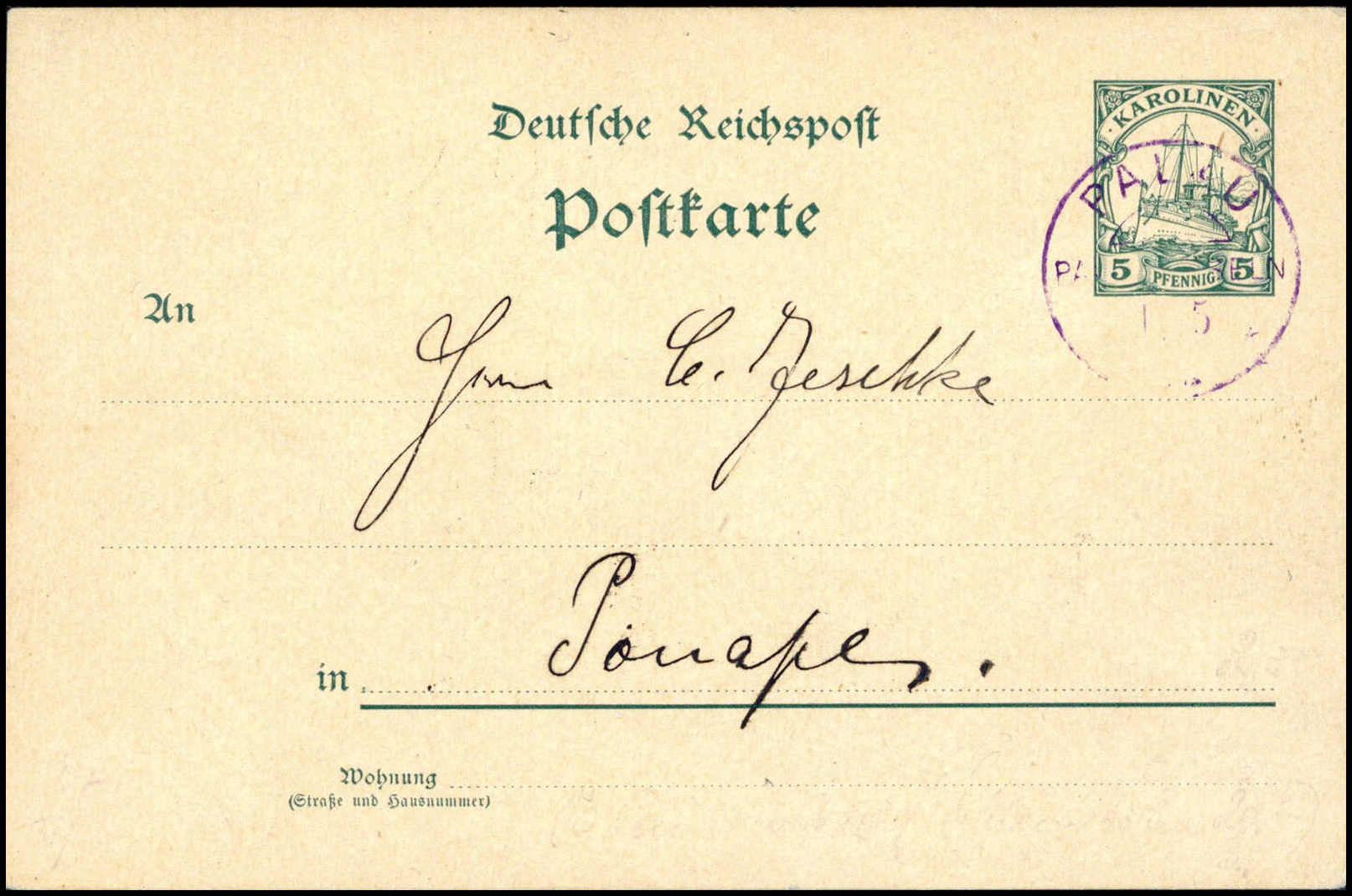 PALAU in Violett, tadellose, philatelist. Ganzsachenkarte 5 Pfg. nach Ponape adressiert