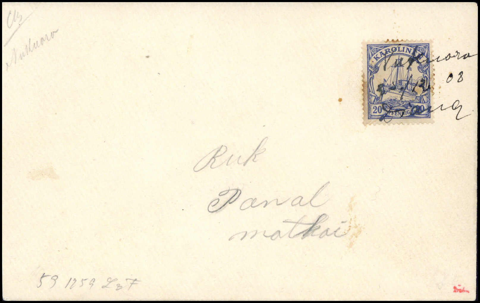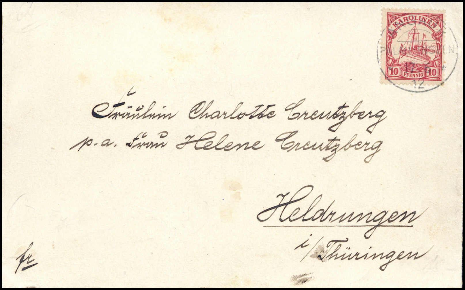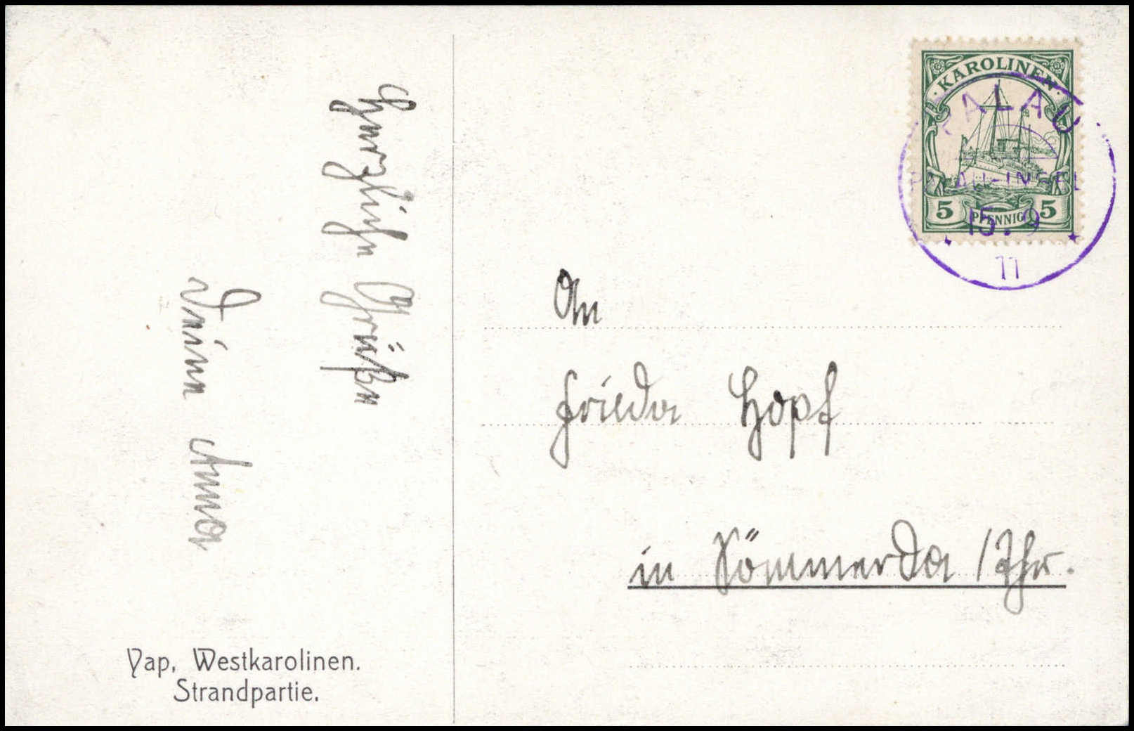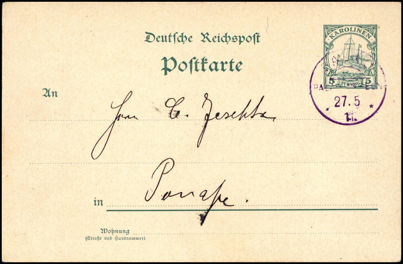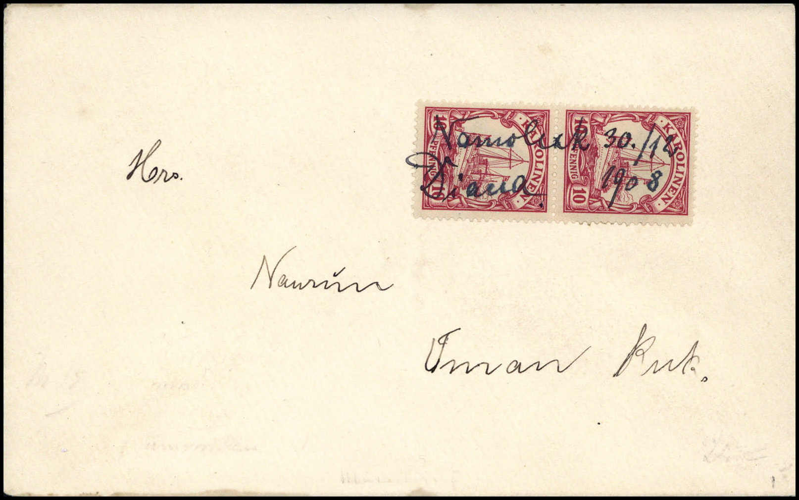 "Ponape 7/10 14" (Kriegsdatum), hs. Abs.-Vermerk auf von einem Belgier geschriebener Postkarte, frankiert mit waagr. Paar 3 Pfg. und 5 Pfg. am Tag der Besetzung der Karolinen durch die Japaner. Die Karte wurde nicht mehr weiterbefördert