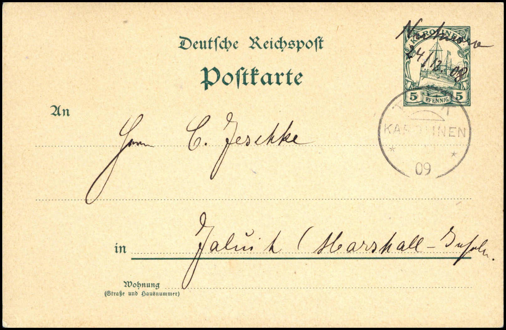"Nukuora" (Nuknoro) 24/12 08, hs. Atoll-Entwertung auf tadelloser Postkarte 5 Pfg. (o.Text) mit Aufgabestempel DRUCK