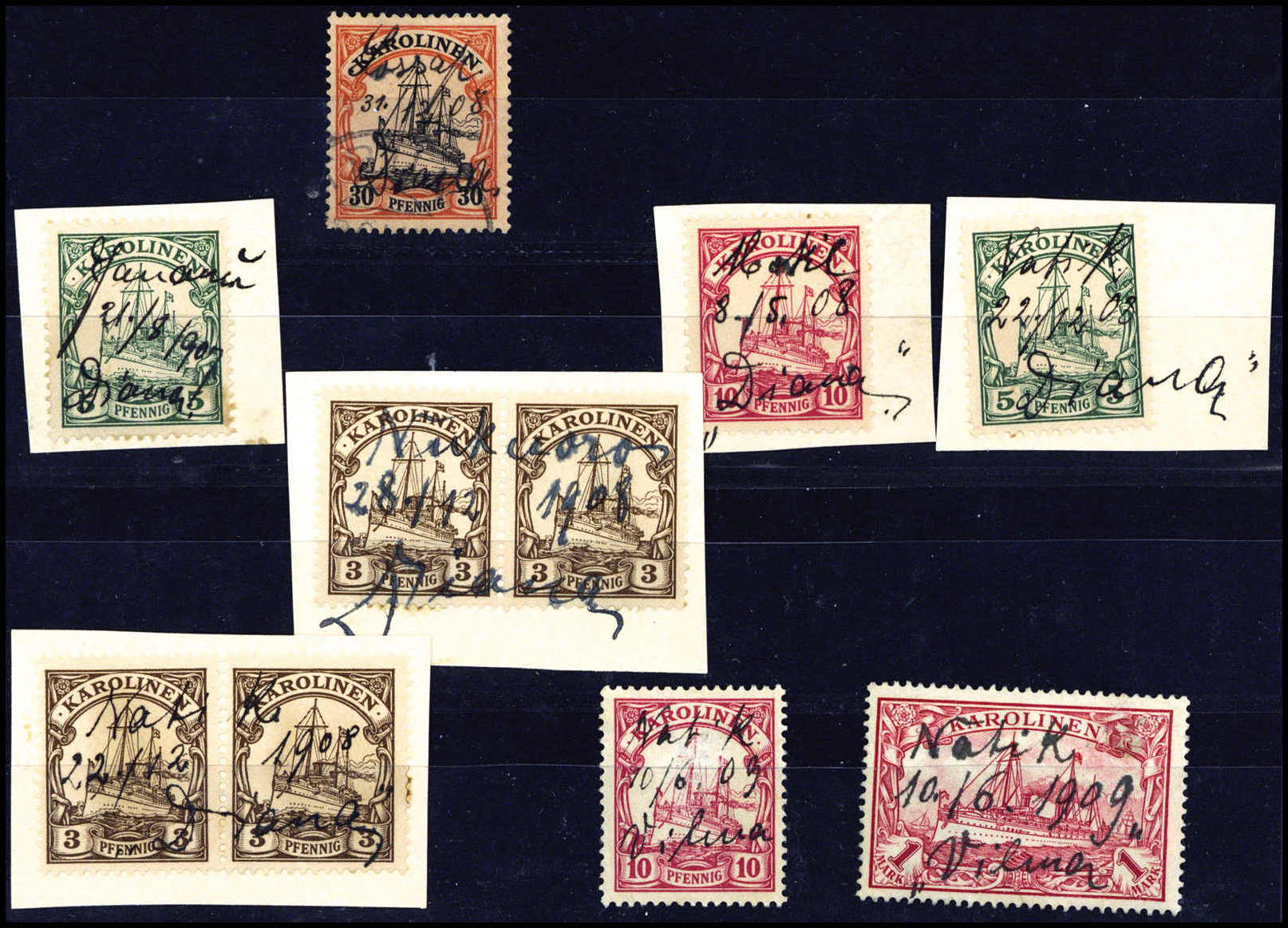 Schöne Partie von hs. Atoll-Entwertungen auf insges. zehn Marken (meist Briefstücke)