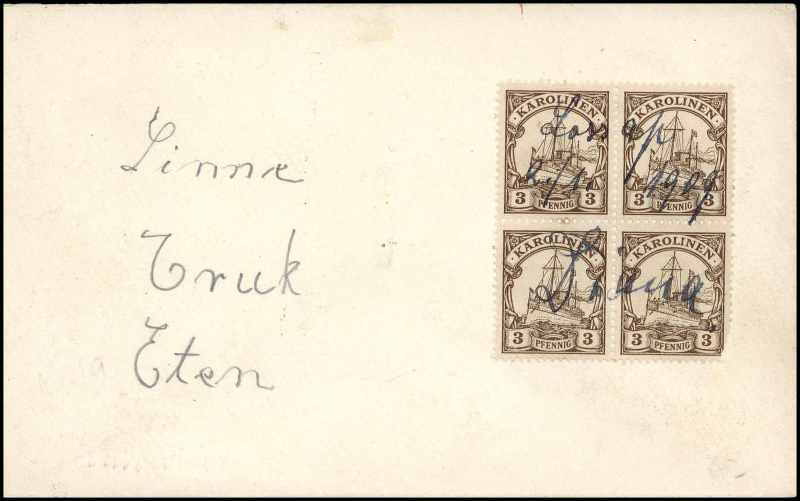 "Lossap 2/1 1909 Diana", hs. Atoll-Entwertung auf philat. Brief mit Viererblock 3 Pfg. (eine Marke Mgl.) nach Truk mit Ak.-Stempel