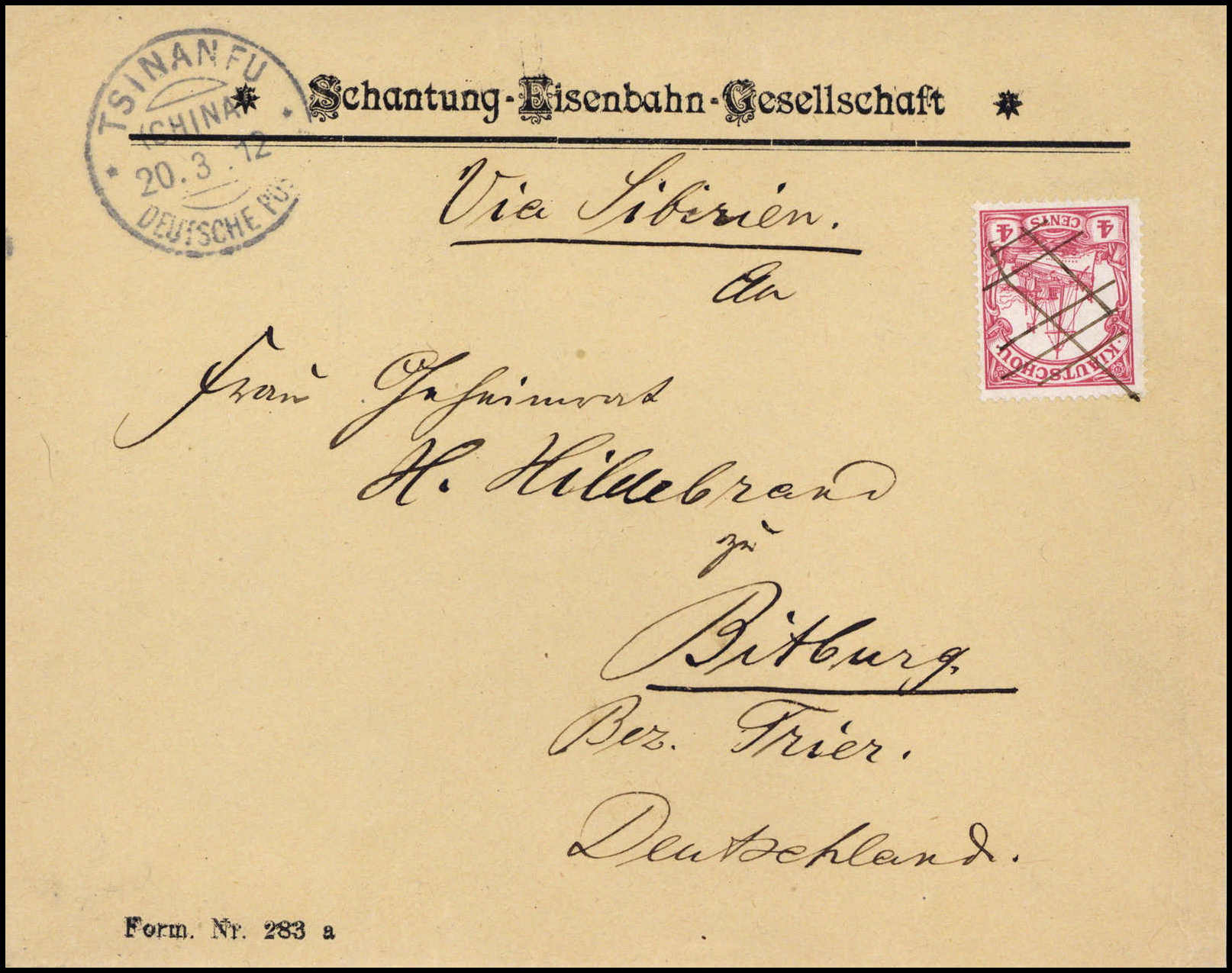 4 C., EF auf tadellosem Firmenkuvert "Schantung-Eisenbahn-Gesellschaft" mit Aufgabestempel TSINANFU 20/3 12 nach Deutschland. Aufgegeben an der Bahnlinie, weshalb die Marke nur mit Federkreuzen entwertet wurde. Sehr selten