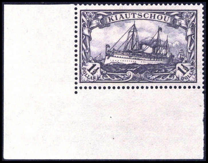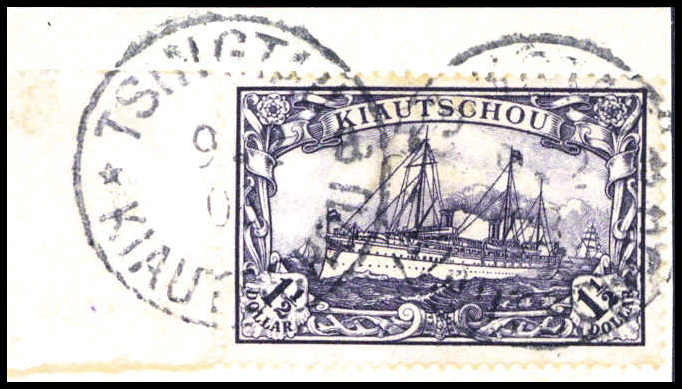 1½ $, linkes Bogenrandstück auf Bfstk. mit zwei klaren Stempeln TSINGTAU 9/2 06 (am Rand winz. gummifleckig), doppelt sign. Bothe BPP. Katalogpreis: 2.000,-