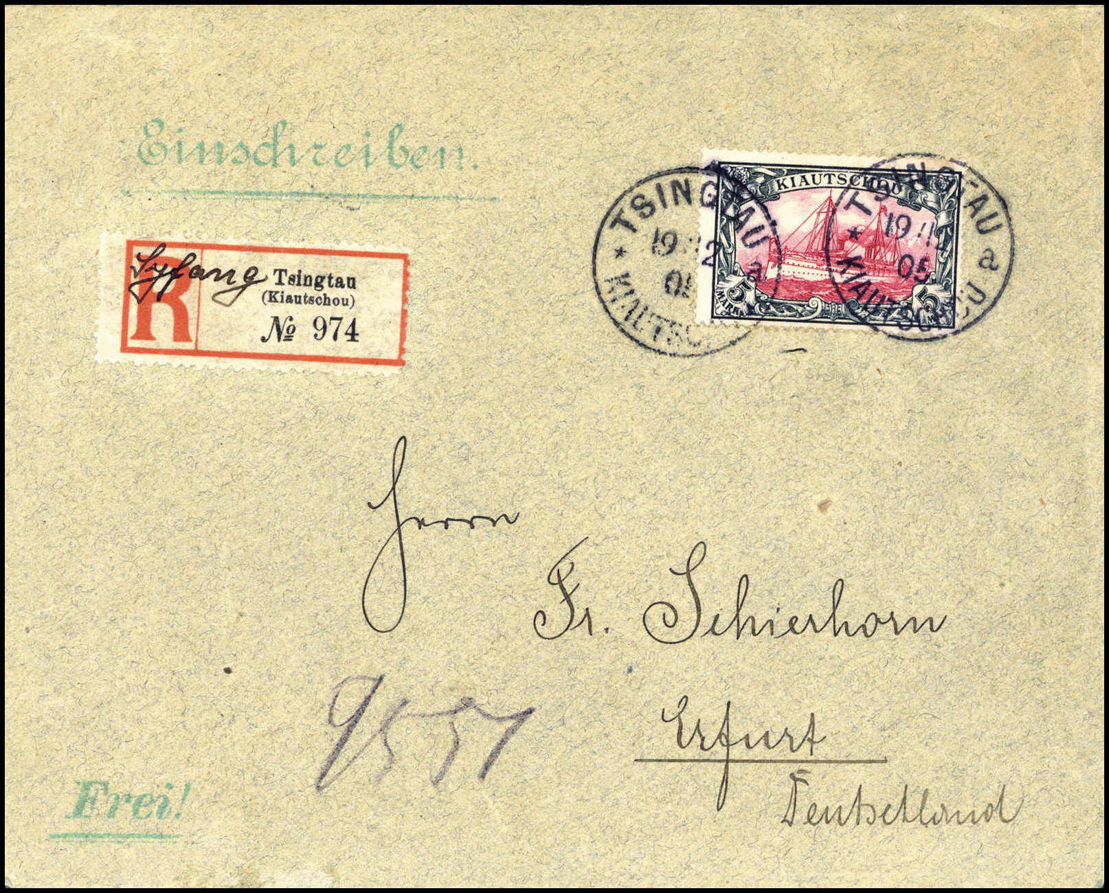5 Mk., tadellose EF mit zwei klaren Stempeln TSINGTAU 19/12 05 auf vorzüglich erhaltenem Einschreibebrief nach Erfurt mit R-Zettel "Syfang" hs. neben "Tsingtau". Katalogpreis: 1.500,-