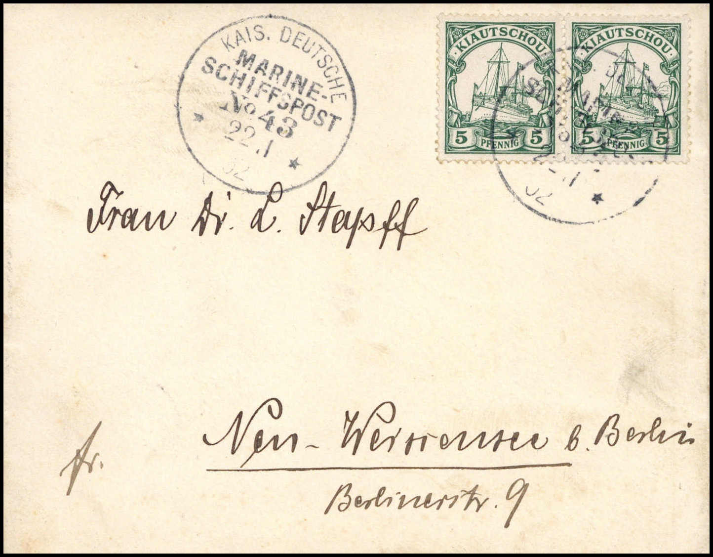 5 Pfg., waagr. Paar auf schönem Bedarfsbrief mit zwei klaren Stempeln K.D.MARINE-SCHIFFSPOST No.43 ("Fürst Bismarck") 22/11 02