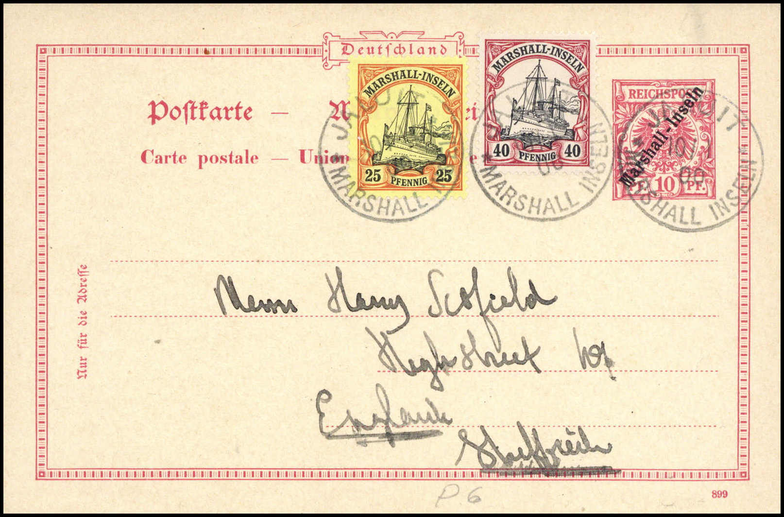 25 und 40 Pfg. auf Ganzsachenkarte 10 Pfg. mit klarem Stempel JALUIT 10/1 00 nach England mit rs. Eingangsstempel