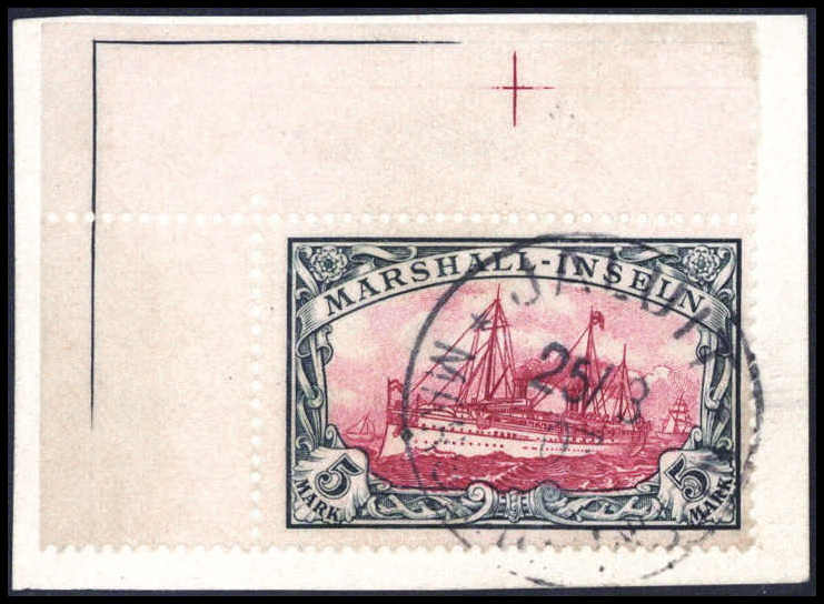 5 Mk., tadellos li. ob. Bogenecke mit Passerkreuz auf Bfstk., zentr. Stempel JALUIT 25/3 07, Fotoattest Jäschke-L.BPP. Katalogpreis: 600,-+