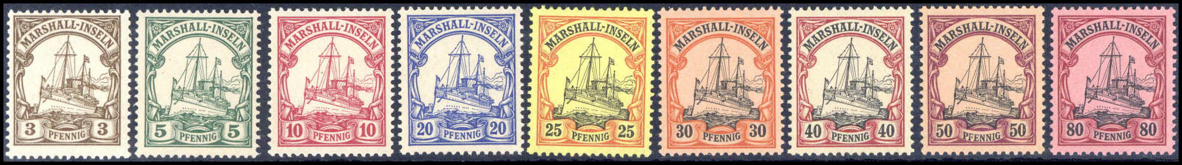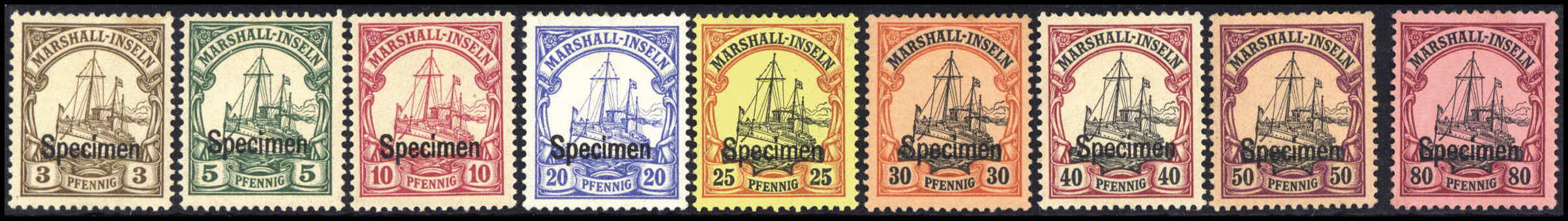 3 Pfg.-5 Mk., Aufdruck "Specimen", sauber ungebr. Serie (50 Pfg. oben 1 Z.). Katalogpreis: 1.300,-