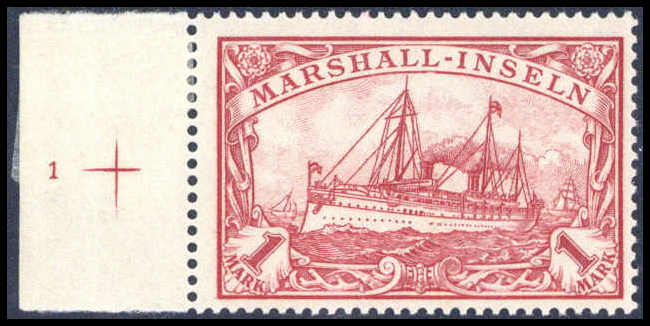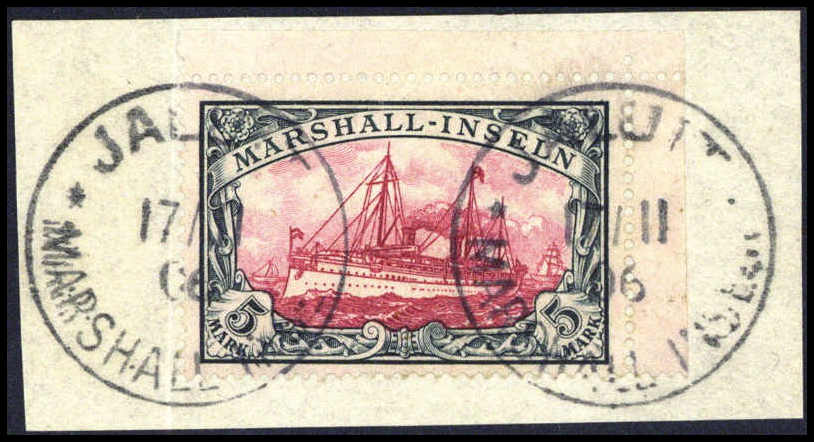 5 Mk., tadelloses, besonders schönes Exemplar aus der re. oberen Bogenecke auf Bfstk. mit klaren Stempeln JALUIT. Katalogpreis: 600,-+