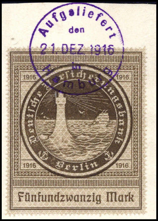 25 Mk., tadelloses Exemplar auf Wertkarten-Abschnitt mit dekorativ aufges. Stempel HAMBURG 21/12 16, Fotoattest Wagner BPP. Katalogpreis: 600,-