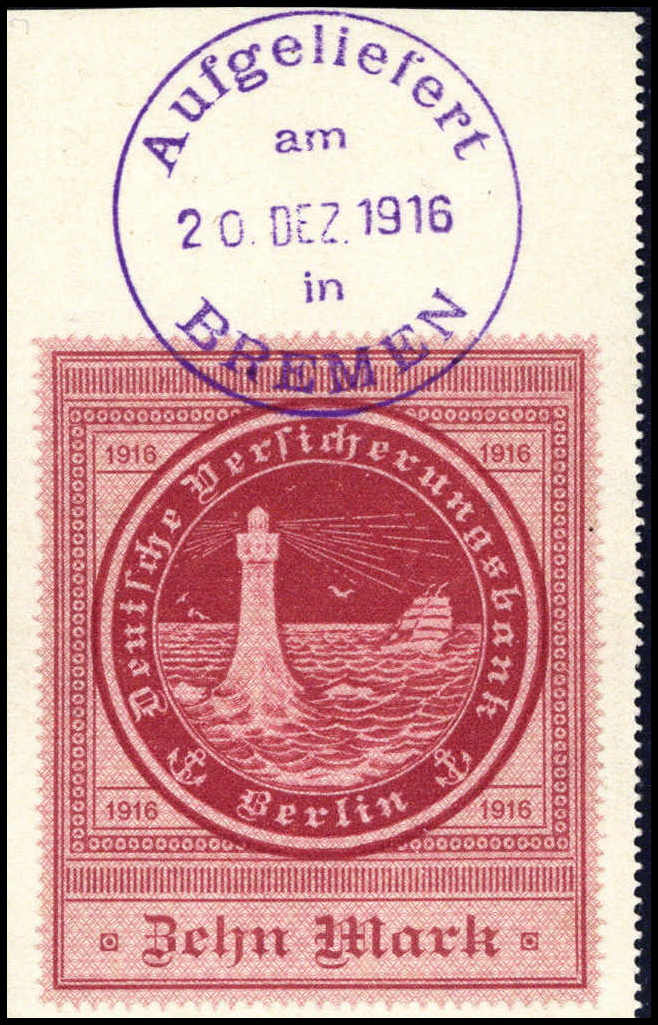 10 Mk., tadelloses Exemplar auf Wertkarten-Abschnitt mit dekorativ, motivfrei aufges. Stempel BREMEN 20/12 16, Fotoattest Wagner BPP. Katalogpreis: 350,-+