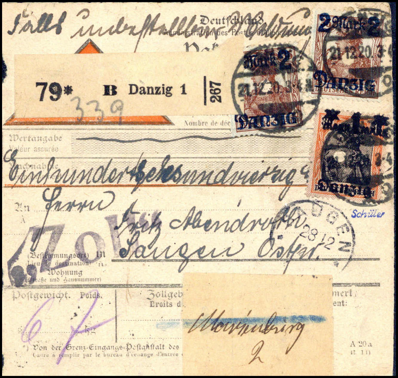 2 Mk., zwei Exemplare mit 4 Mk. (alle Marken mit Sicherungslochung vor dem Aufkleben) auf Nachnahme-Paketkarte mit Stempel DANZIG 21/12 20 nach Ostpreußen, Fotobefund Oechsner BPP